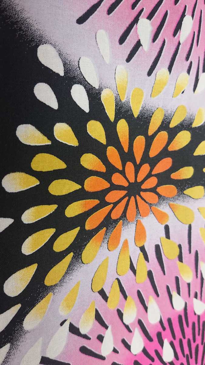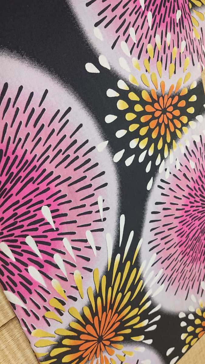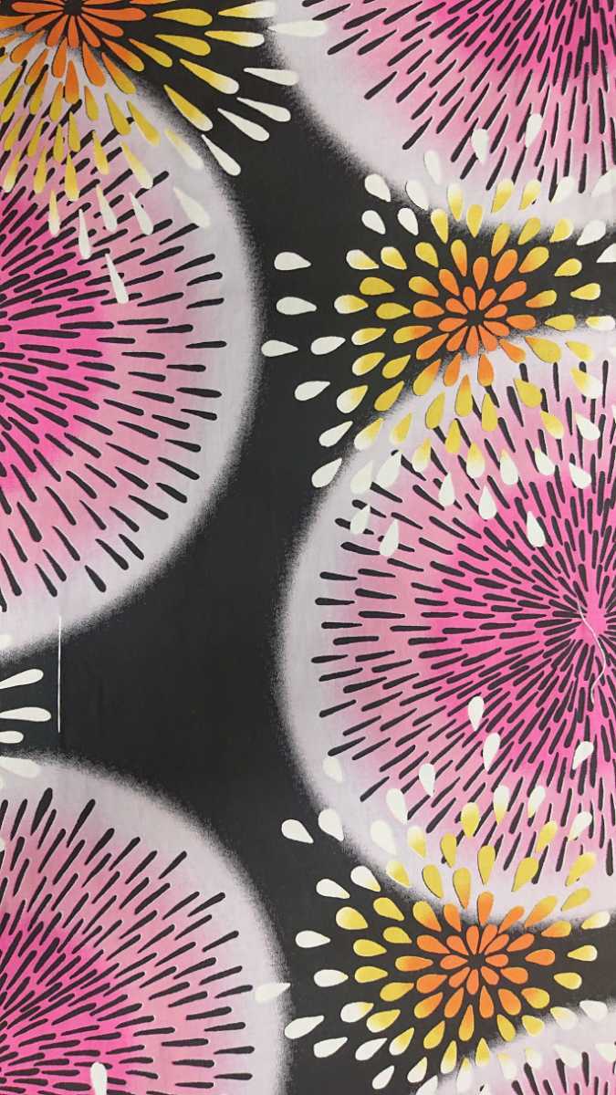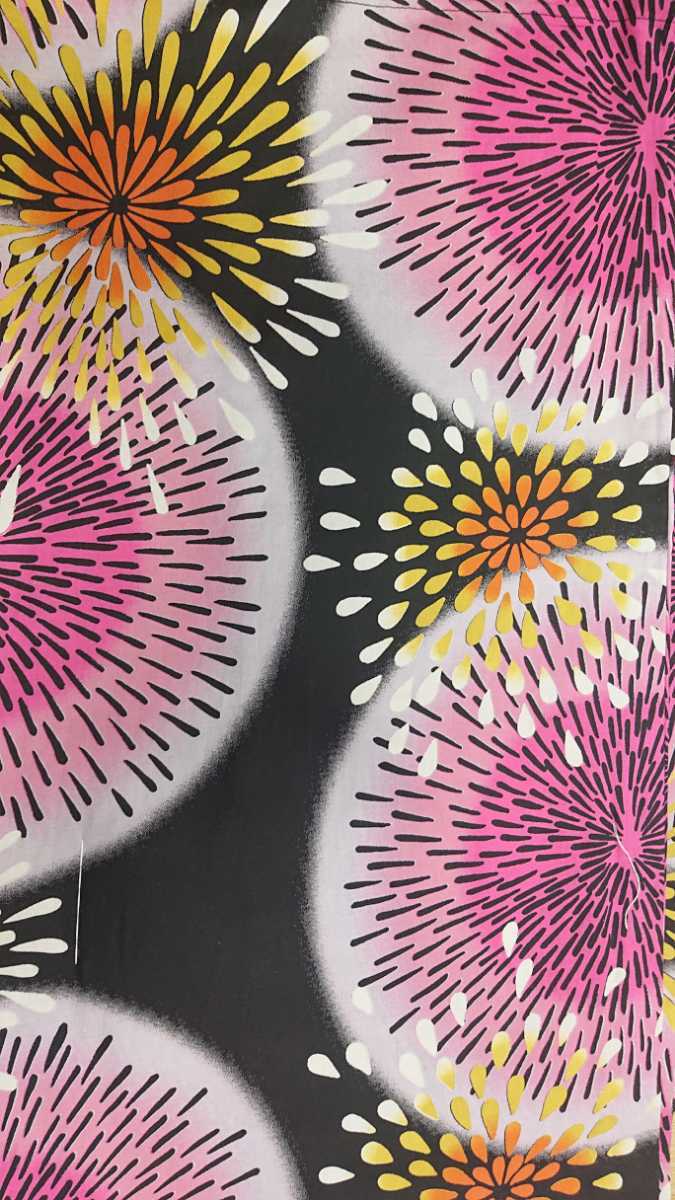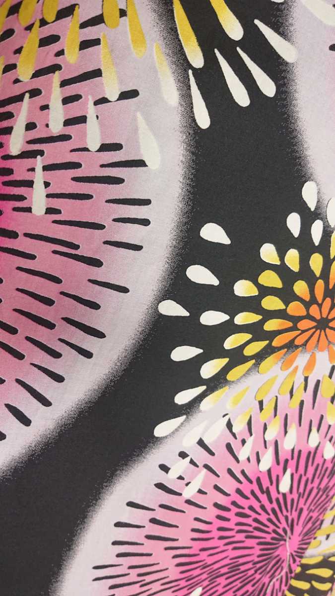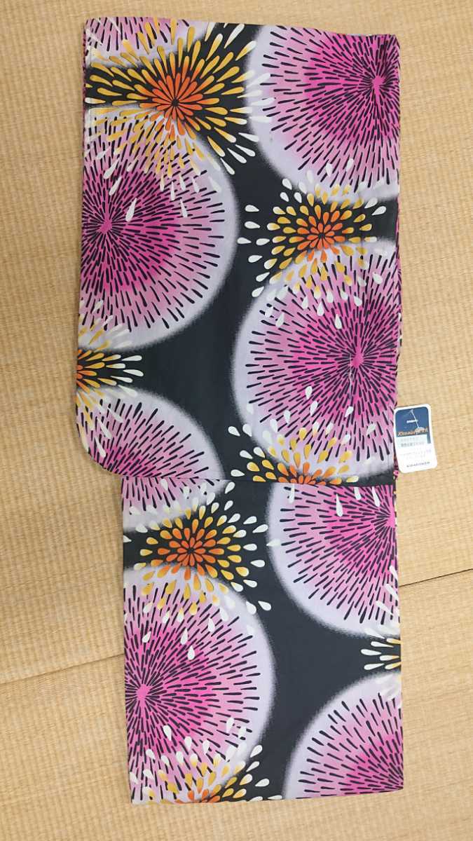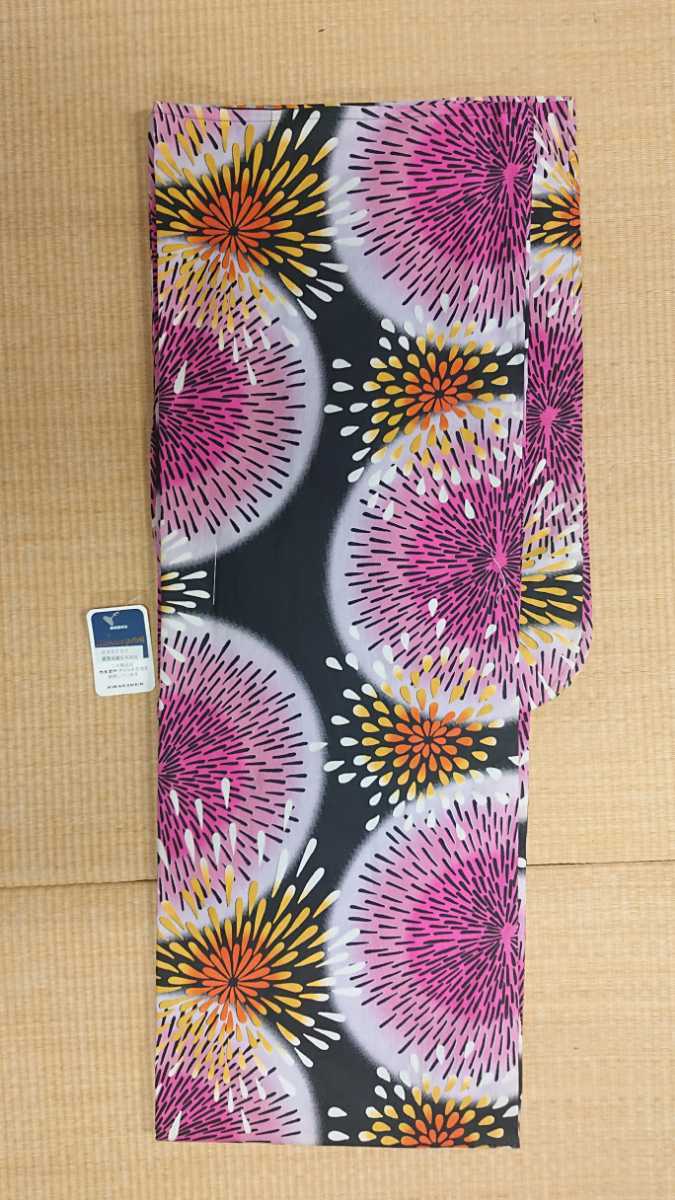 花火文様がデザインされ生地にカネボウプリントが施された仕立て上がり浴衣です。