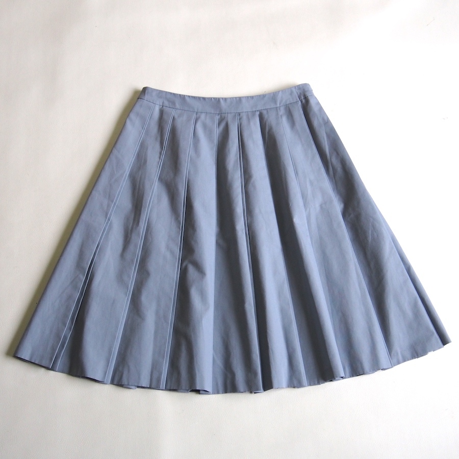 シンプルなひざ丈のプリーツスカートです。 くすんだブルーが落ち着いた色味で子供っぽくなりすぎず、末長くお使いいただけます。