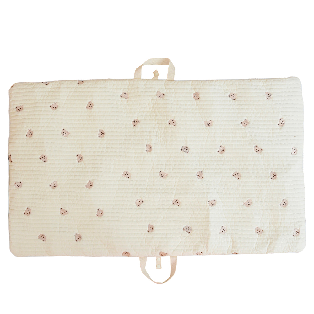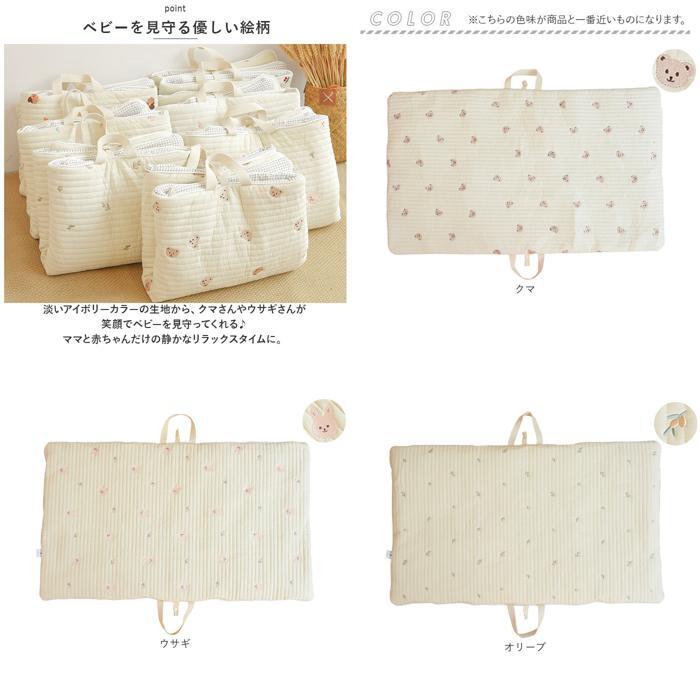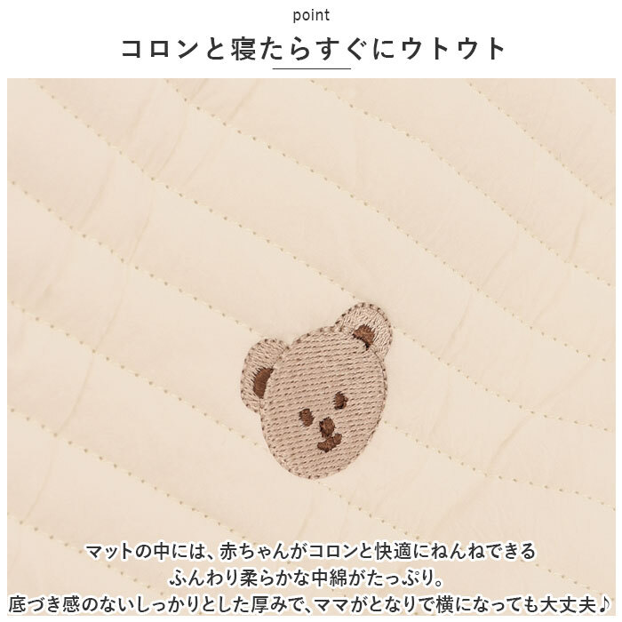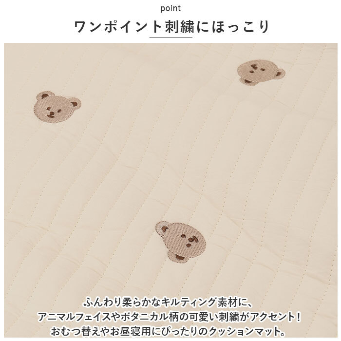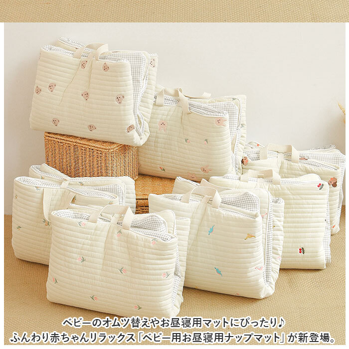 | 商品説明 | ・・ベビーのオムツ替えやお昼寝用マットにぴったり♪ふんわり赤ちゃんリラックス「ベビー用お昼寝用ナップマット」が新登場。 ・【ワンポイント刺繍にほっこり】 ・ふんわり柔らかなキルティング素材に、アニマルフェイスやボタニカル柄の可愛い刺繍がアクセント!おむつ替えやお昼寝用にぴったりのクッションマット。 ・【コロンと寝たらすぐにウトウト】 ・マットの中には、赤ちゃんがコロンと快適にねんねできるふんわり柔らかな中綿がたっぷり。底づき感のないしっかりとした厚みで、ママがとなりで横になっても大丈夫♪ ・【安全に遊べるプレイマットにも】 ・フローリングの床にサッと広げられる、縦:約65cm×横:約110cmのゆったりワイドサイズ。おもちゃやぬいぐるみを置いたら、楽しく安全に遊べるプレイマットに早変わり。 ・【リバーシブルデザイン】 ・表面は、可愛らしいアニマルやフラワー柄の刺繍デザイン。裏面はシンプルなウィンドウペンチェック柄になので、その日の気分やシーンに合わせて使い分けができるのも嬉しいポイント。 ・【ご家庭でカンタンお洗濯】 ・マットの汚れが気になったらお洗濯が可能。いつも清潔に使えるので、お肌の敏感なベビーでも安心。(※手洗い推奨。洗濯機で洗う場合は洗濯ネットに入れ、手洗いコースなど、生地を傷めないお洗濯モードで洗ってください。) ・【お出掛けにもラクラク持ち運び】 ・パタパタと小さく折りたたんで、スナップボタンをパチンッと留めれば、ハンドル付きのバッグのような形状になって、とってもコンパクト。 ・【お出掛けにもラクラク持ち運び】 ・持ち運びと保管に便利な不織布バッグが付属。自動車でのお出掛けや旅行先にも手軽に持っていけるから、とっても便利! ・【ベビーを見守る優しい絵柄】 ・淡いアイボリーカラーの生地から、クマさんやウサギさんが笑顔でベビーを見守ってくれる♪ママと赤ちゃんだけの静かなリラックスタイムに。 |