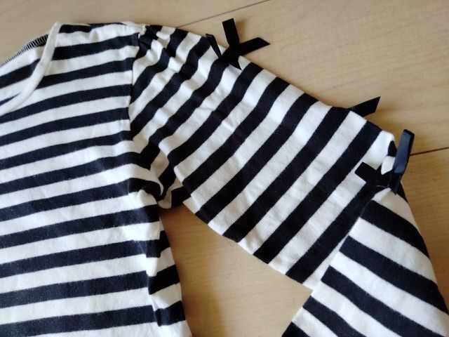 白x黒のボーダー生地に、袖の黒リボンがとっても可愛いです。