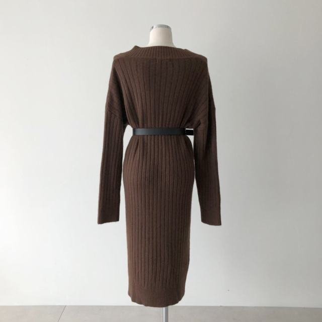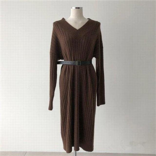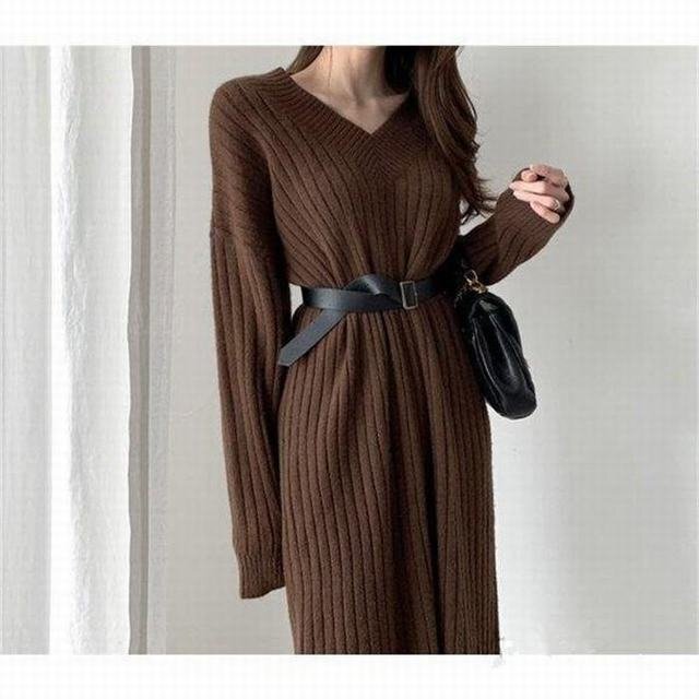 ニットワンピース レディース 長袖 ロング丈 Vネック 大きいサイズ Aライン ゆったり 着痩せ 秋 冬 コーヒー