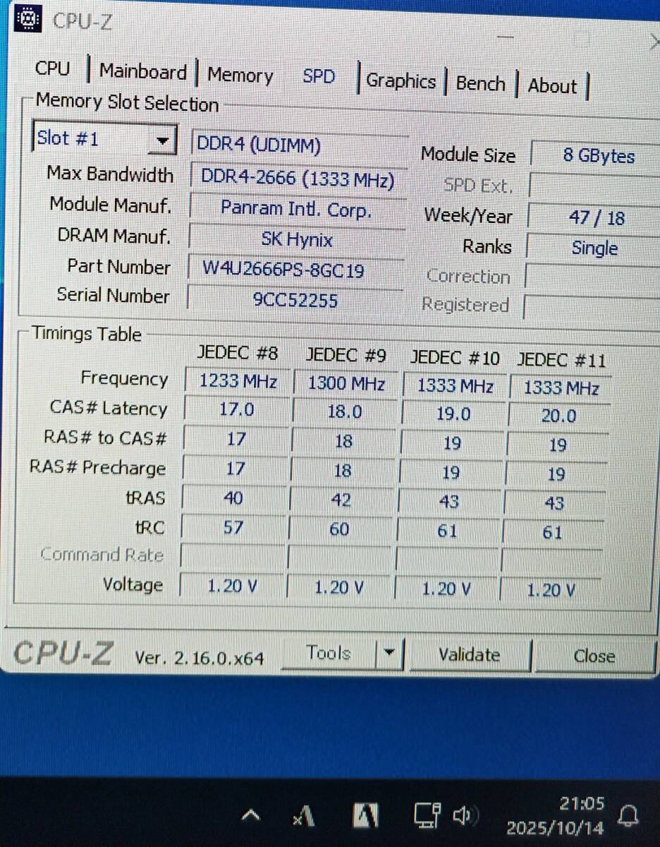 メモリチップはSK HynixでDDR4 2666 PC4 21300 8Gx2=16 GBです