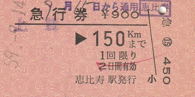 E060.【発券別駅】上野 59.9.14【0280】恵比寿駅発行