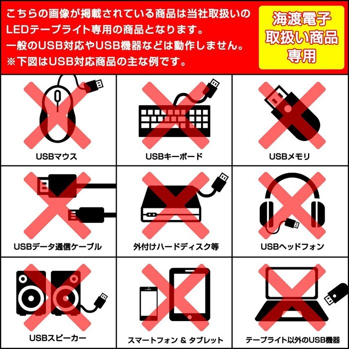 | ※弊社取り扱いの5V LEDテープライト専用です。 その他のUSB機器にはご使用いただけません。 | |