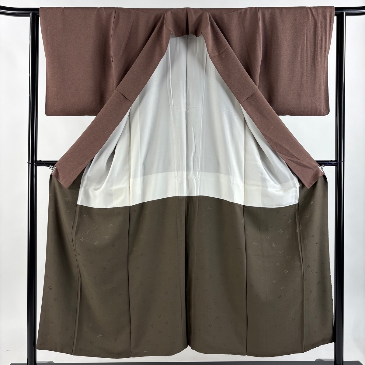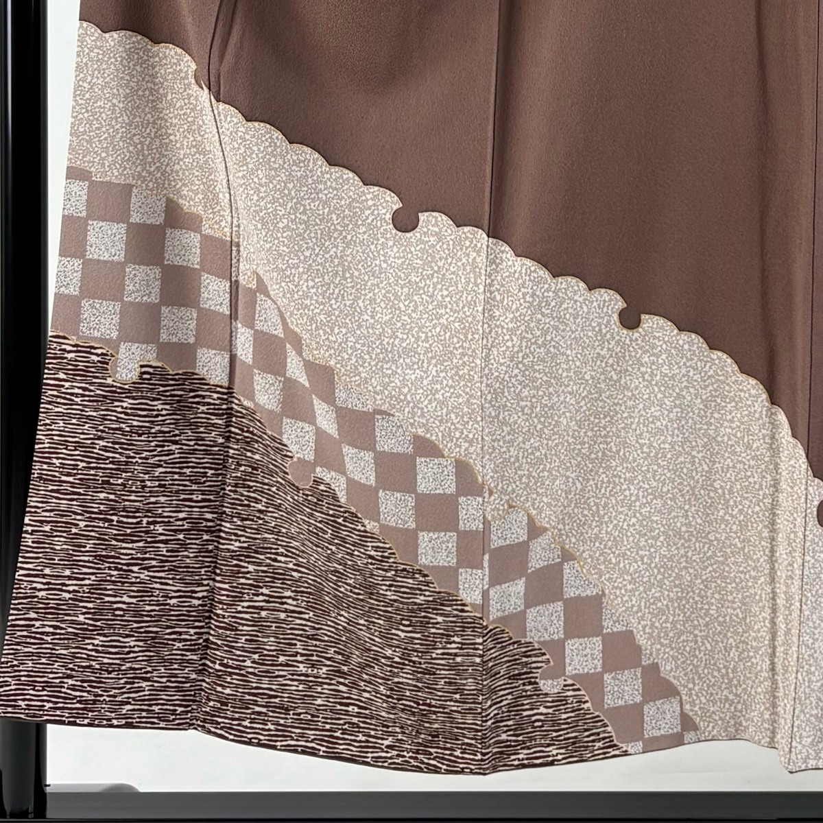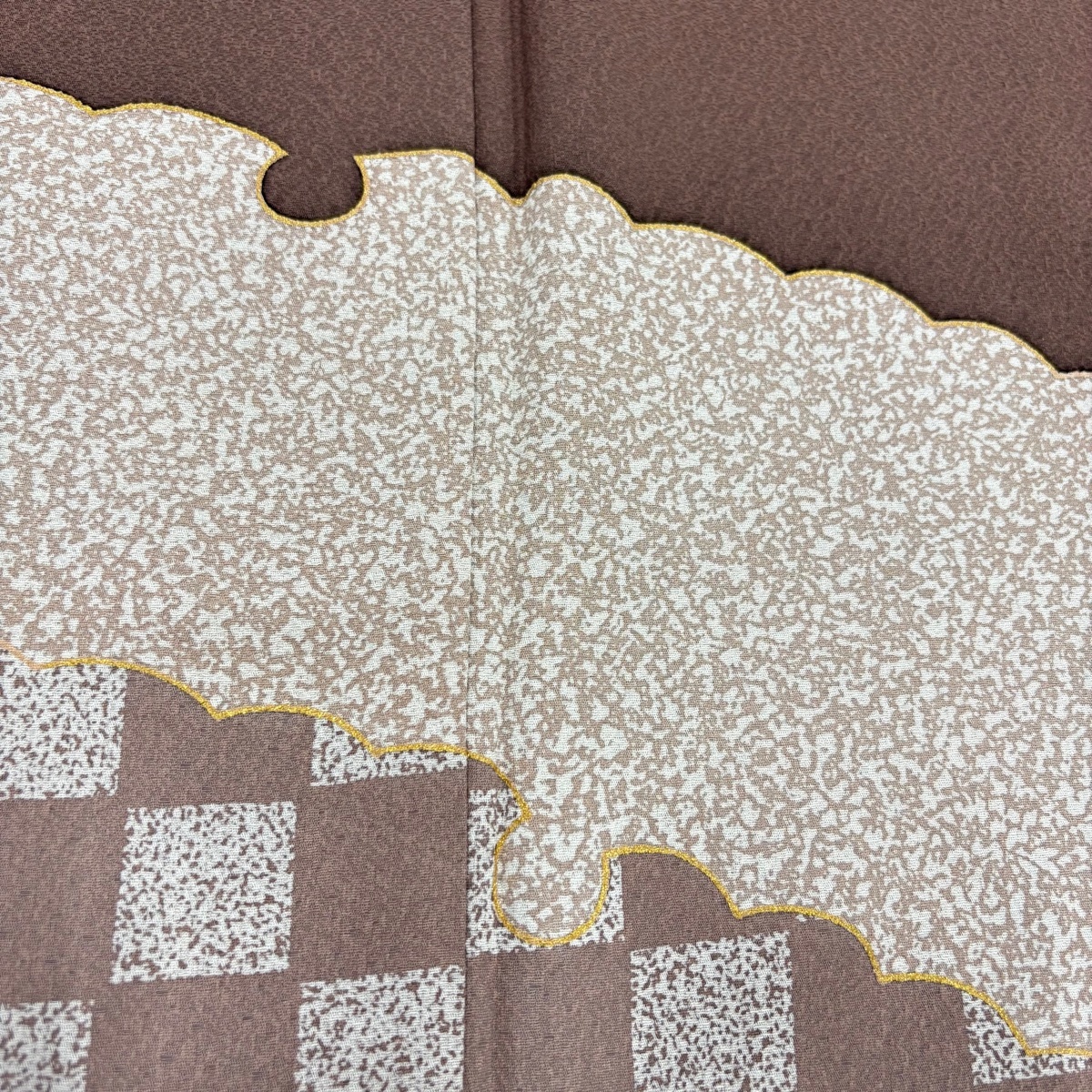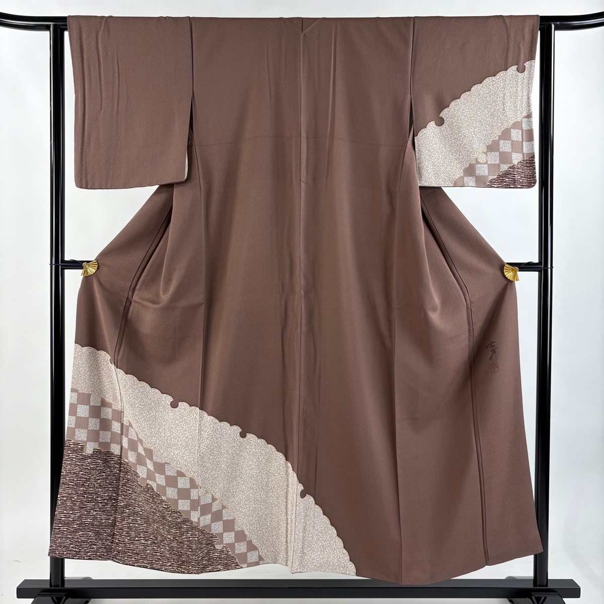 | 付下げ 美品 名品 大久保玄才 落款 雪輪 市松 金彩 小豆色 袷 身丈152 裄丈63.5 S 正絹 【中古】 |
