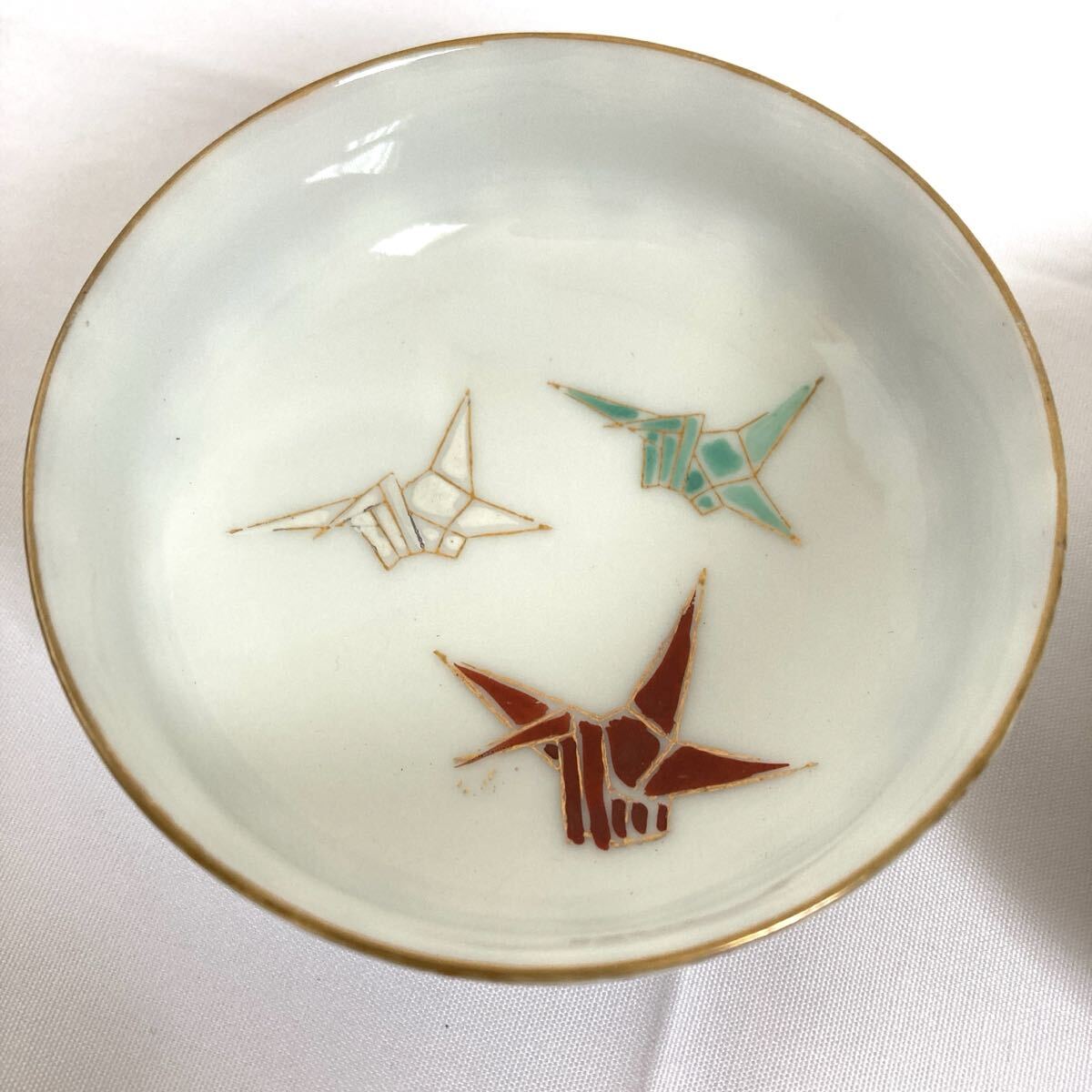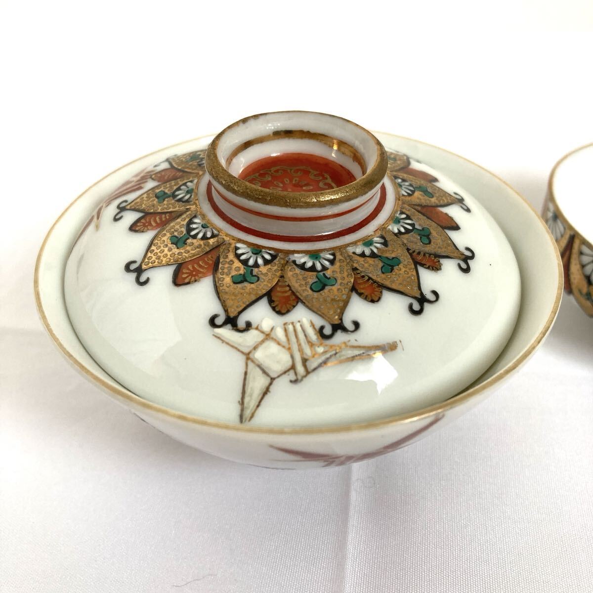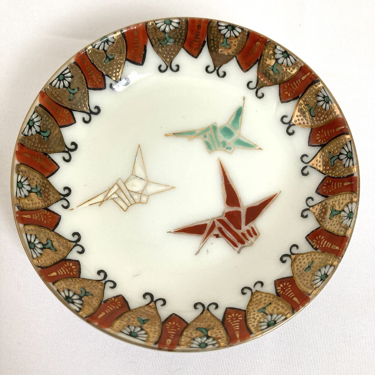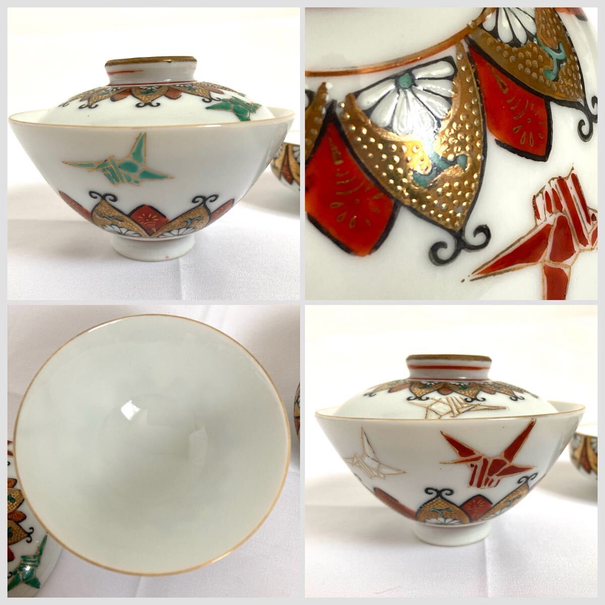 昭和レトロ 九谷焼 蓋つきお茶碗 小皿2種 折り鶴 植物柄 ボタニカル 小ぶりご飯茶碗