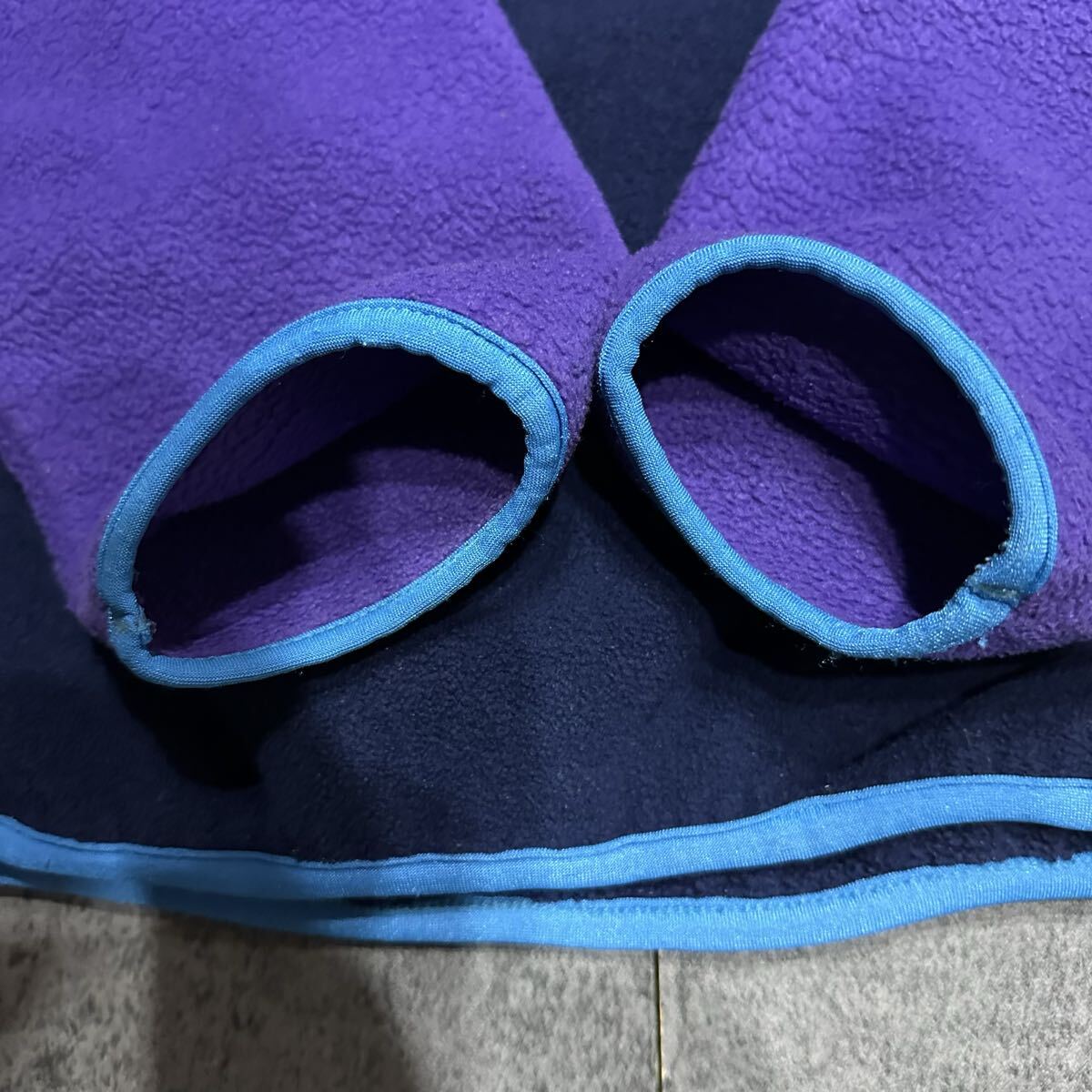 配色はフリースが紫×紺、ナイロンもパイピングも水色になります。