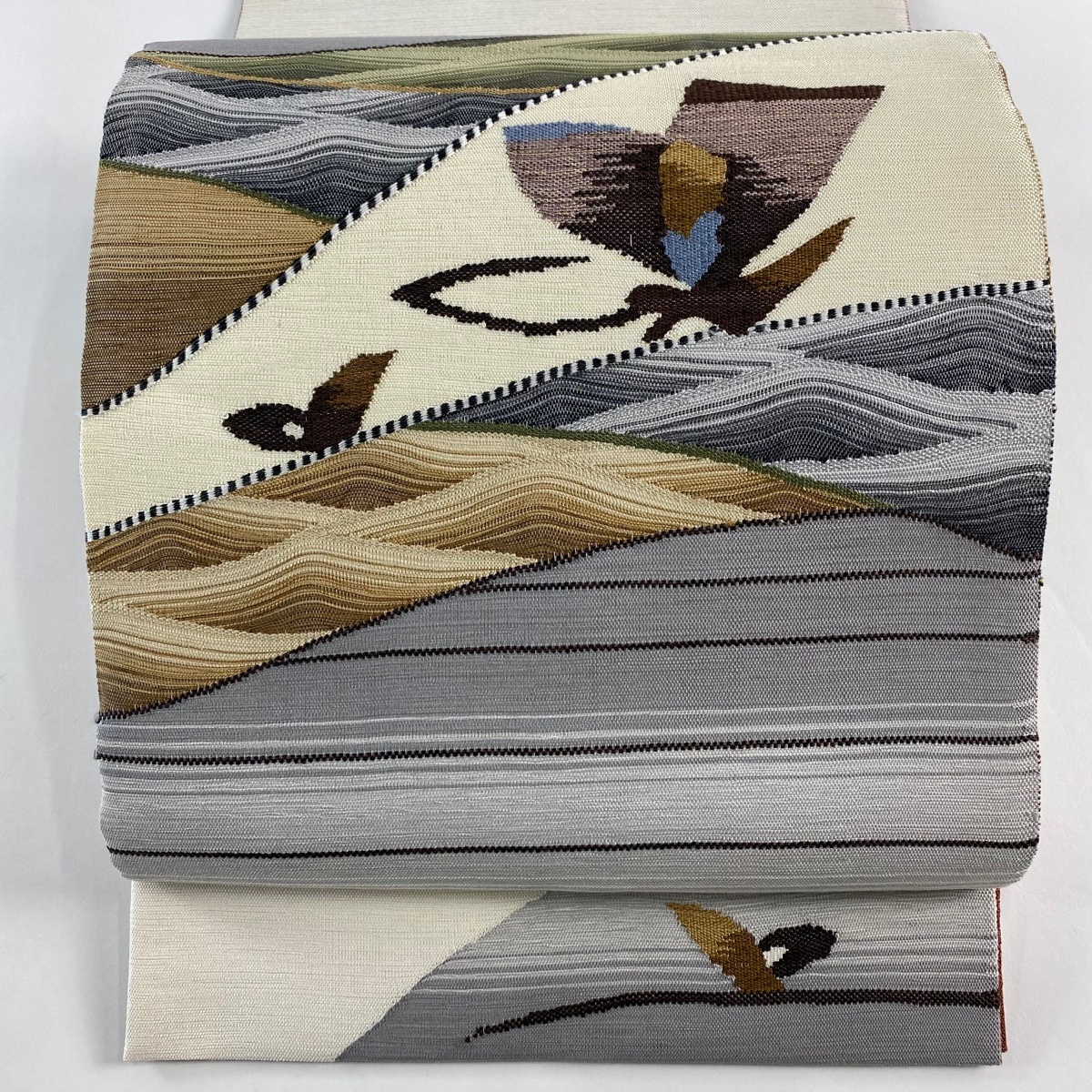 | 袋帯 美品 秀品 紬地 幾何学模様 クリーム お太鼓柄 正絹 【中古】 |