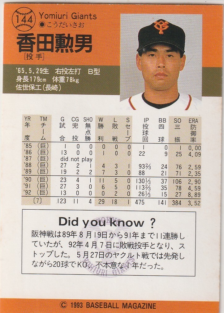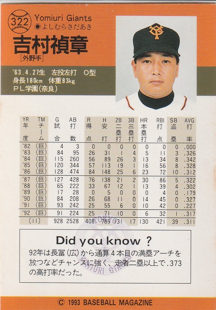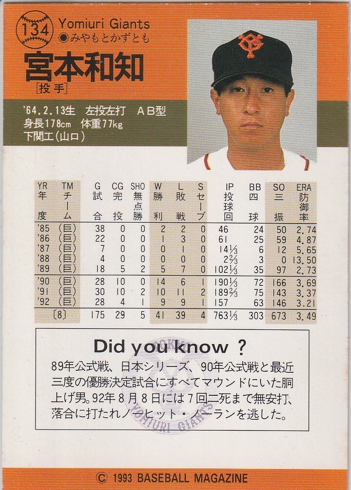 ●1993BBM【宮本 和知,香田 勲男,吉村 禎章】BASEBALL CARD No.134,144,322:巨人 R