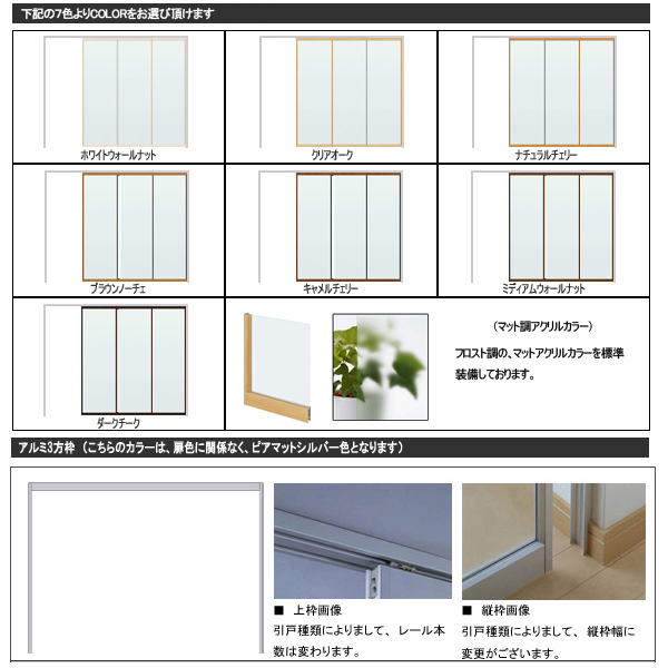 | 商品紹介 | ○ アルミ 可動間仕切り スクリーンパーテーション ○ 商品のサイズはお客様が取付致します、ご希望のサイズに合わせてお届け致します ○ アルミカラーは(アニグレ)(ノーチェ) (ウォールナット)の3種類よりお選び頂けます ○ パネル部分は、安全なアクリル樹脂製(マット仕上げ)4mm厚 ○ 取付部は上吊りでバリアフリーにも対応 ○ アルミ3方枠が標準にて付属致します ★ オプションにて、ガイドレール、ソフトクローズ機能を追加可能です ★ キッチンとダイニングとの間仕切りや、広いリビングを機能的に間仕切る等、デザインを損なわずにお使いいただくことが可能です ★ 寝室や、子供室等の本格的な入口戸には、若干不向きな点がございますので、お使い頂く場所で、お悩みのお客様はお気軽にご相談下さい |