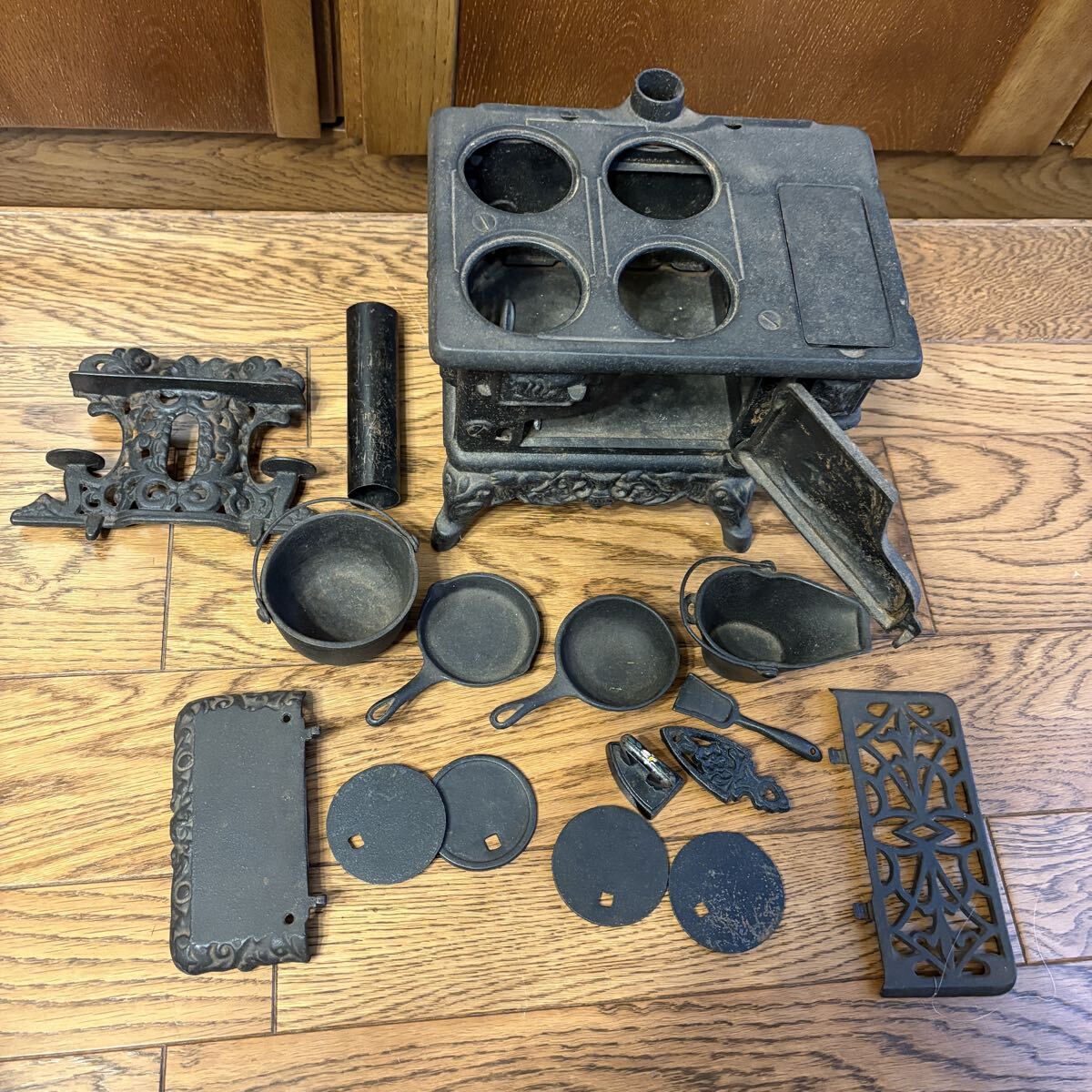 サイドテーブル2個、煙突部品2個、バケツ&フライパン4個、シャベル1個、アイロン&アイロン台格1、コンロの蓋4個