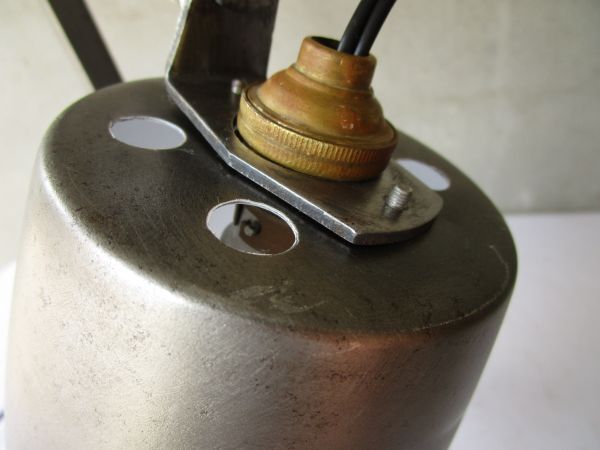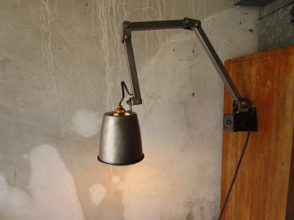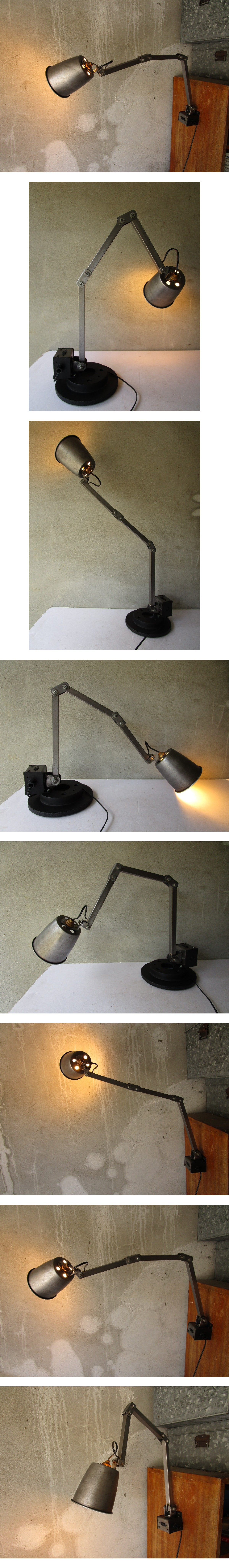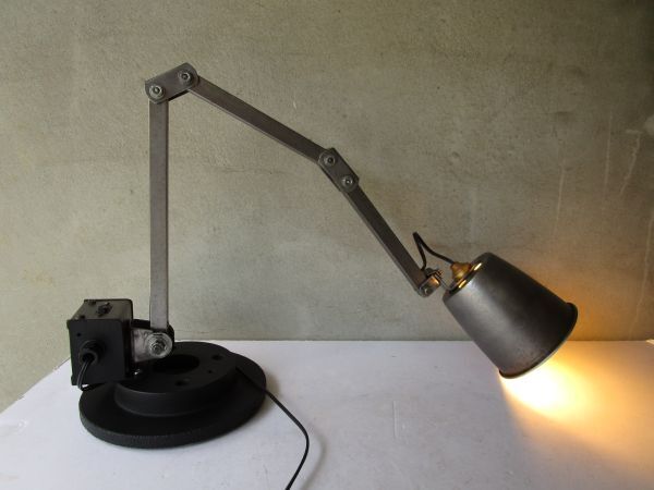 オリジナルペイントをすべてはがして、軽くクリアコートした品物で、角ハイプのアーム、スイッチBOXの形状等シエード以外は直線を基本にデザインされたフォルムは重厚感がありながらシャープで洗練された印象の1品。ボルト締めのジョイント部の形状もメカニカルでクールです。 3か所のジョイント部分でアームの前倒し、シェード部分の前後左右、スイッチBOXを支点にした左右のスイングなど可動箇所も多めで使い勝手もいいと思います。