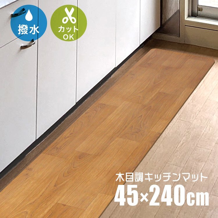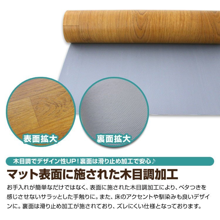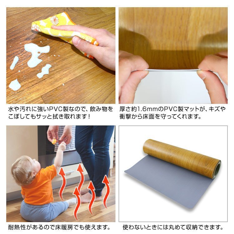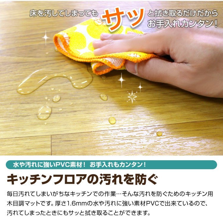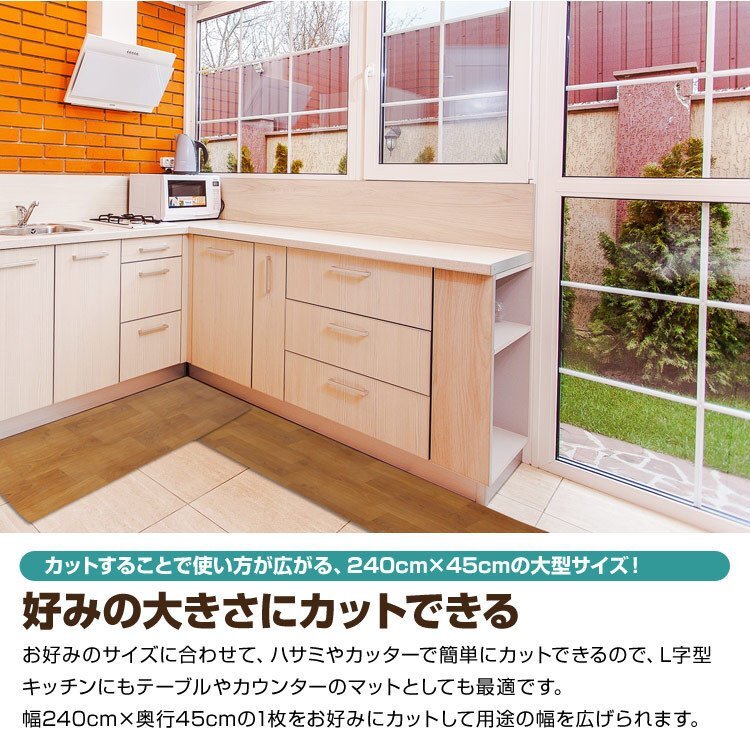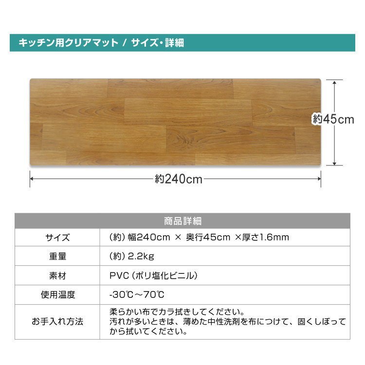 キッチン周りの床面を傷や汚れから守るキッチンマットです。 インテリアのアクセントや床に馴染みもよいデザインで、お部屋のイメージを損ねない!! 耐熱性があるので床暖房の上でも使用OK! 240cmの大型サイズで簡単にカットすることができるので、ダイニングテーブルやカウンターのマットとしても最適です! 【商品仕様】 カラー:木目調 サイズ(約):幅240cm×奥行45cm(厚さ1.6mm) 重量(約):2.2kg 材質:PVC(ポリ塩化ビニール) 使用温度(約):-30℃~70℃ 【注意事項】 ※お手入れは薄めた中性洗剤を湿らした布につけ、固く絞って拭いた後、水分が残らないように乾いた布で乾拭きしてください。 ※日の当たる所で使用しないでください。日焼けで硬化する場合があります。 |
