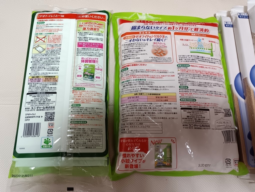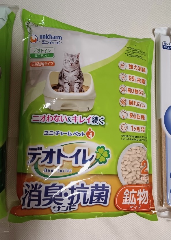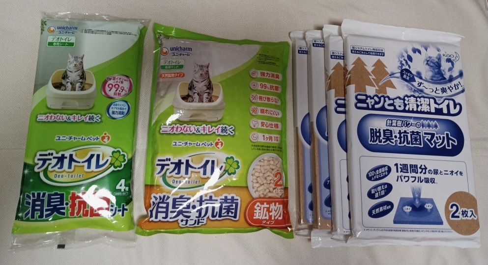 送料込み デオトイレ用 消臭抗菌シート1袋、鉱物タイプ消臭抗菌サンド1袋、消臭抗菌マット4袋 です。