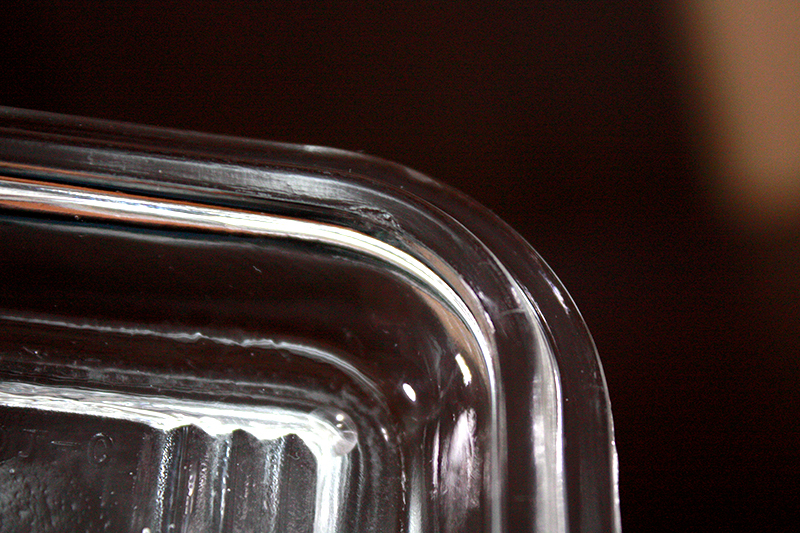 猫、トウモロコシ、コーヒーミルなどがデザインされた、Sサイズのレフリジレーター(冷蔵庫)用の保存容器です。ガラス蓋に浅いチップがあります。(画像⑩)