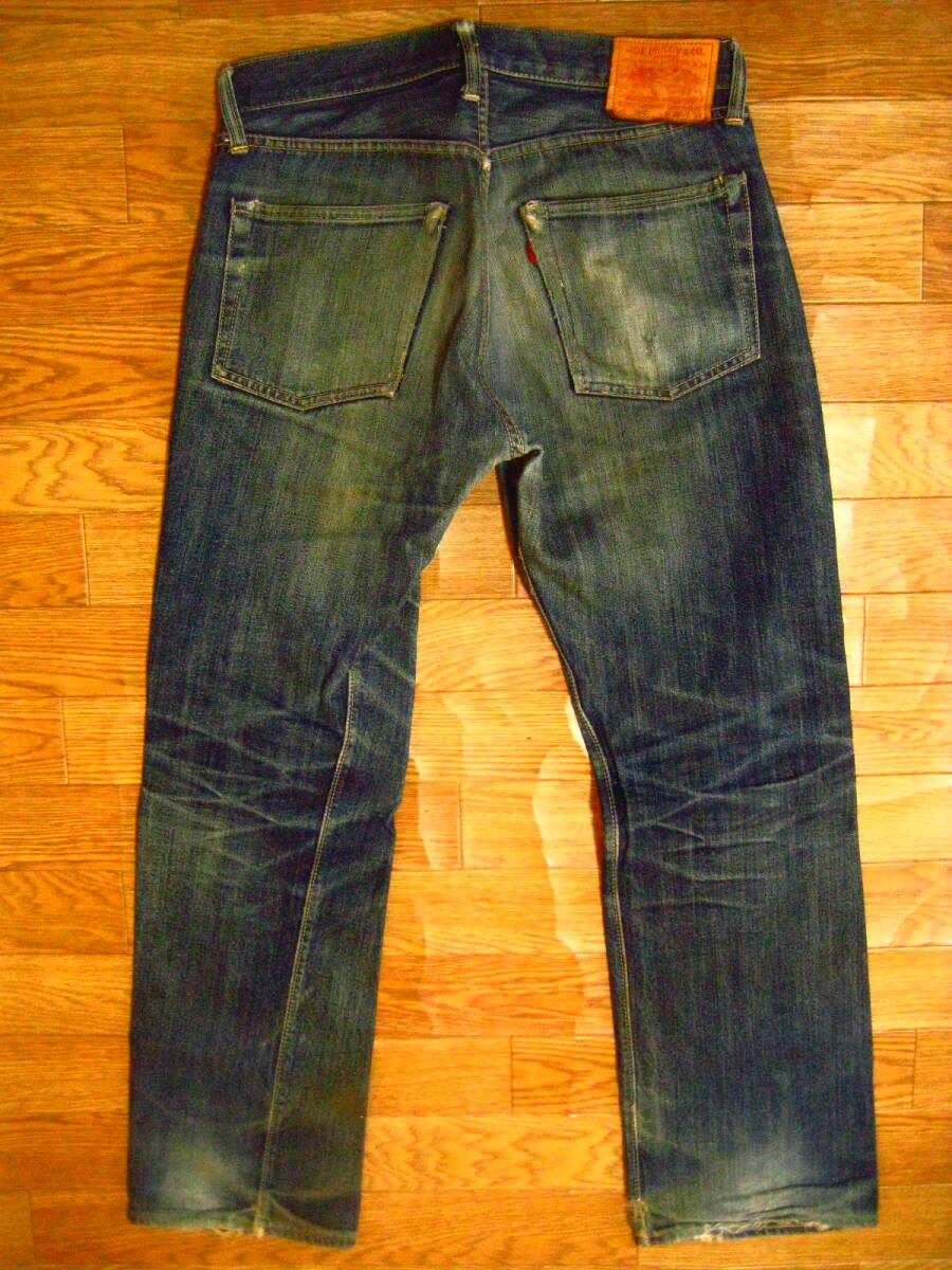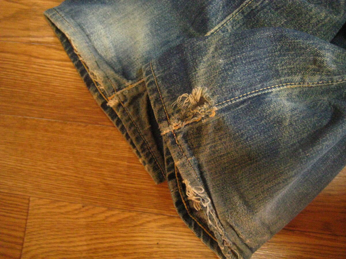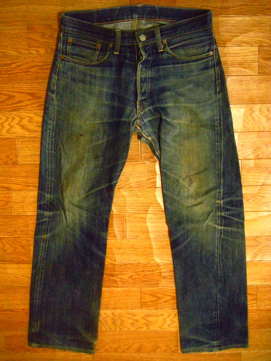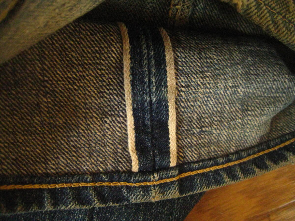 。○●サイズ表記●○。 W29L34 ボタンフライ 。○●平置きで実寸サイズ●○。 ウエスト約79㎝、レングス約73.5㎝、裾幅約21.5㎝ 太もも幅約31.5cm、股上前約26㎝、総丈約100㎝ ●程よい色感になります 。 ●革パッチ・赤タブ・隠しリベット・ウエストバンドとバックポケットの縁はシングルステッチ・Vステッチ・各セルビッジ・裾はチェーンステッチ(ホツレ有)などなど。 ●極上の風格、しっかりとしたメリハリ感、ヒゲ・アタリ・タテ落ち感もこれから楽しめる1本になります。 ●実にカッコいいパンツになっております。激安で出品いたしますのでぜひこの機会にどうですか!!!