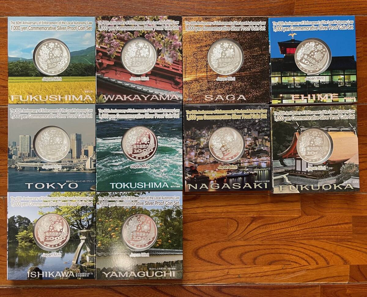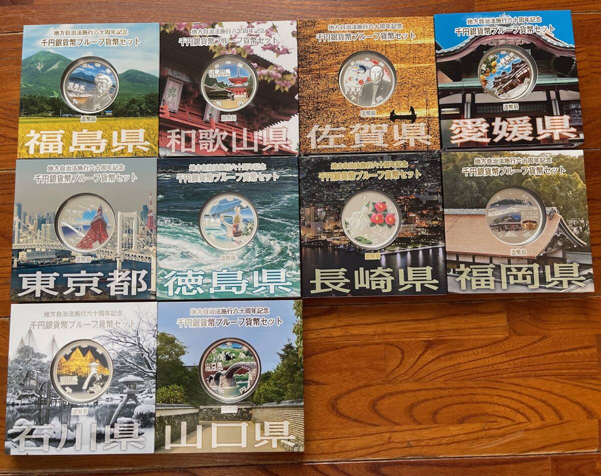 一円スタート地方自治施行六十周年記念千円銀貨幣10点まとめ売り福島 和歌山 佐賀 愛媛 東京 徳島 長崎 福岡 石川 山口 等保管品