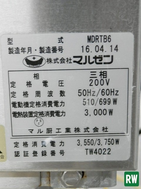 | 食器洗浄機 マルゼン MDRTB6 三相200V 2016年製 扉前開き 業務用 食洗機 トップクリーン |