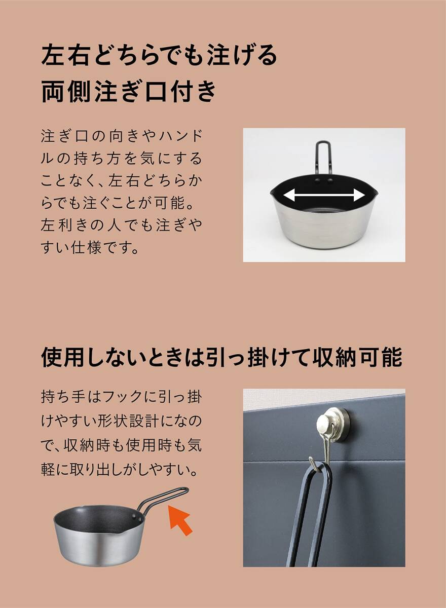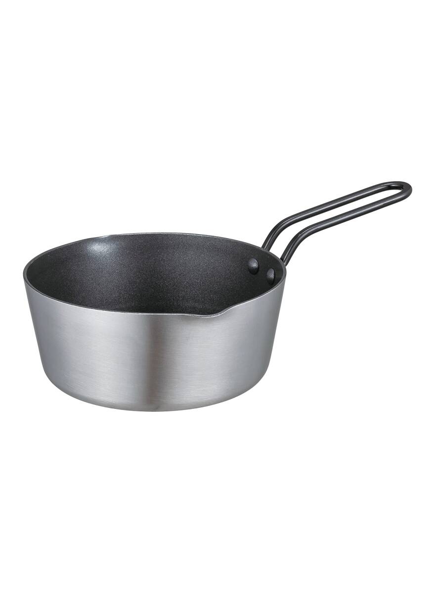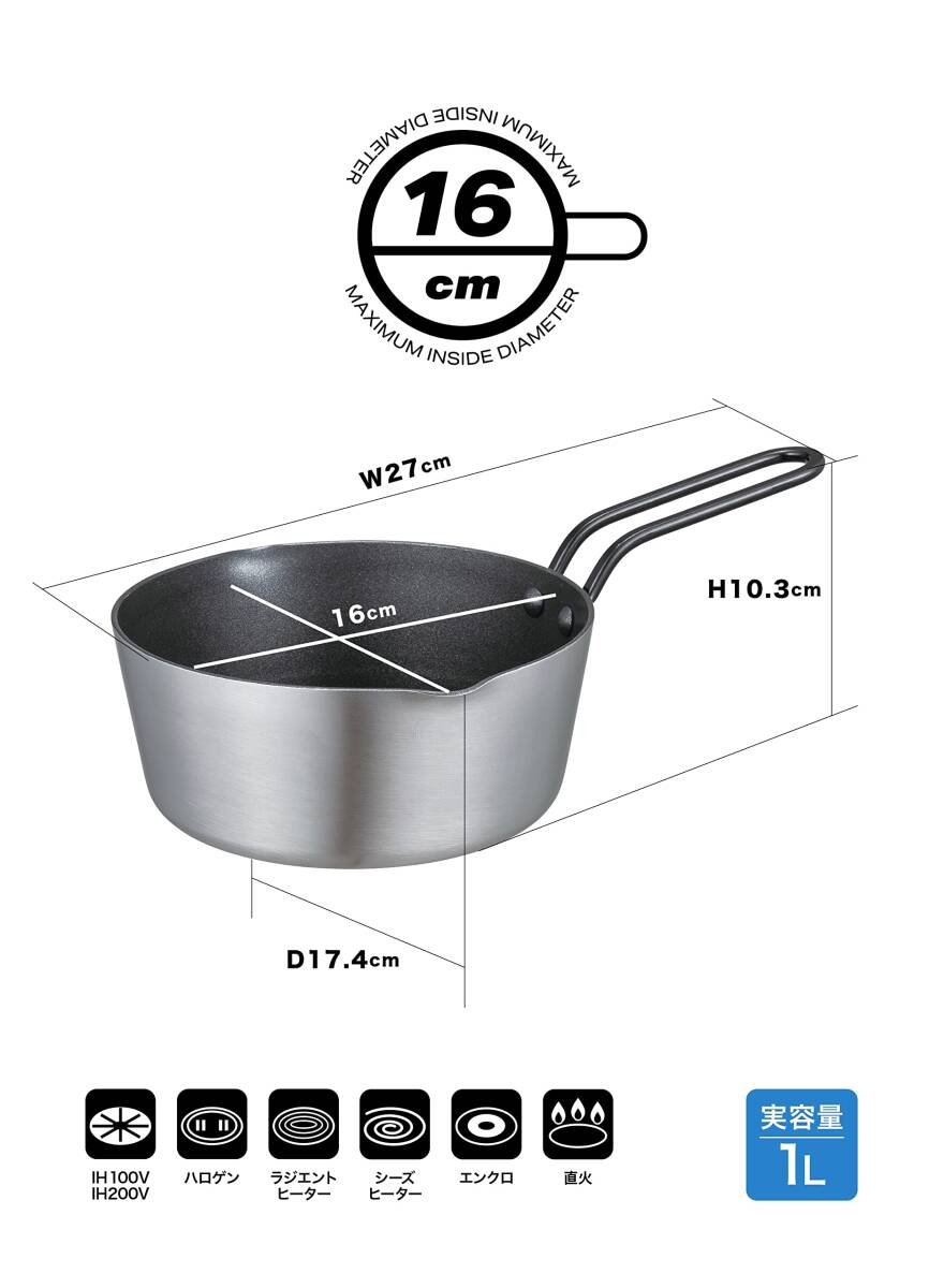 商品サイズ:約幅27×奥行17.4×高10.3cm 商品重量:約435g 満水容量:約1.2L 実容量:約1L 最大内径:16cm 底の厚さ:1.8mm(はり底を含む) 主材質:[本体]アルミニウム合金、ステンレス鋼、[ハンドル]ステンレス鋼 表面加工:[内面]ふっ素樹脂塗装加工、[外面]サテン仕上げ ※使用可能熱源:IH100V・200V、ガス、シーズ、エンクロ、ラジエント、ハロゲン ※以下のものでは使用しないでください。 ※使用不可:電子レンジ、オーブン、ストーブ、食器洗浄機、食器乾燥機、金属ヘラ