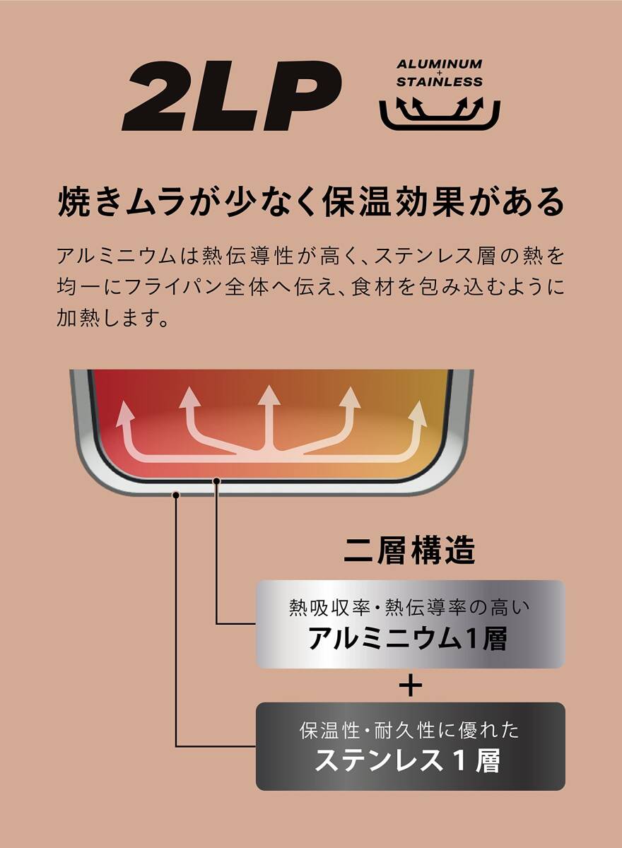 ・焼きムラが少なく保温効果があるアルミニウムとステンレスの2層構造。アルミニウムは熱伝導性が高く、ステンレス層の熱を均一にフライパン全体へ伝え、食材を包み込むように加熱します。