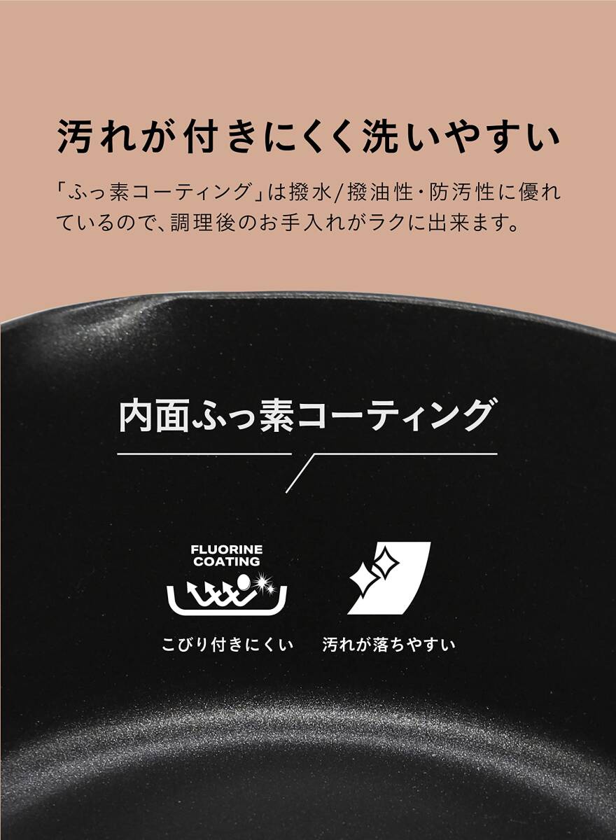 ・汚れが付きにくく洗いやすい「内面ふっ素コーティング」撥水/撥油性・防汚性に優れているので、調理後のお手入れがラクに出来ます。