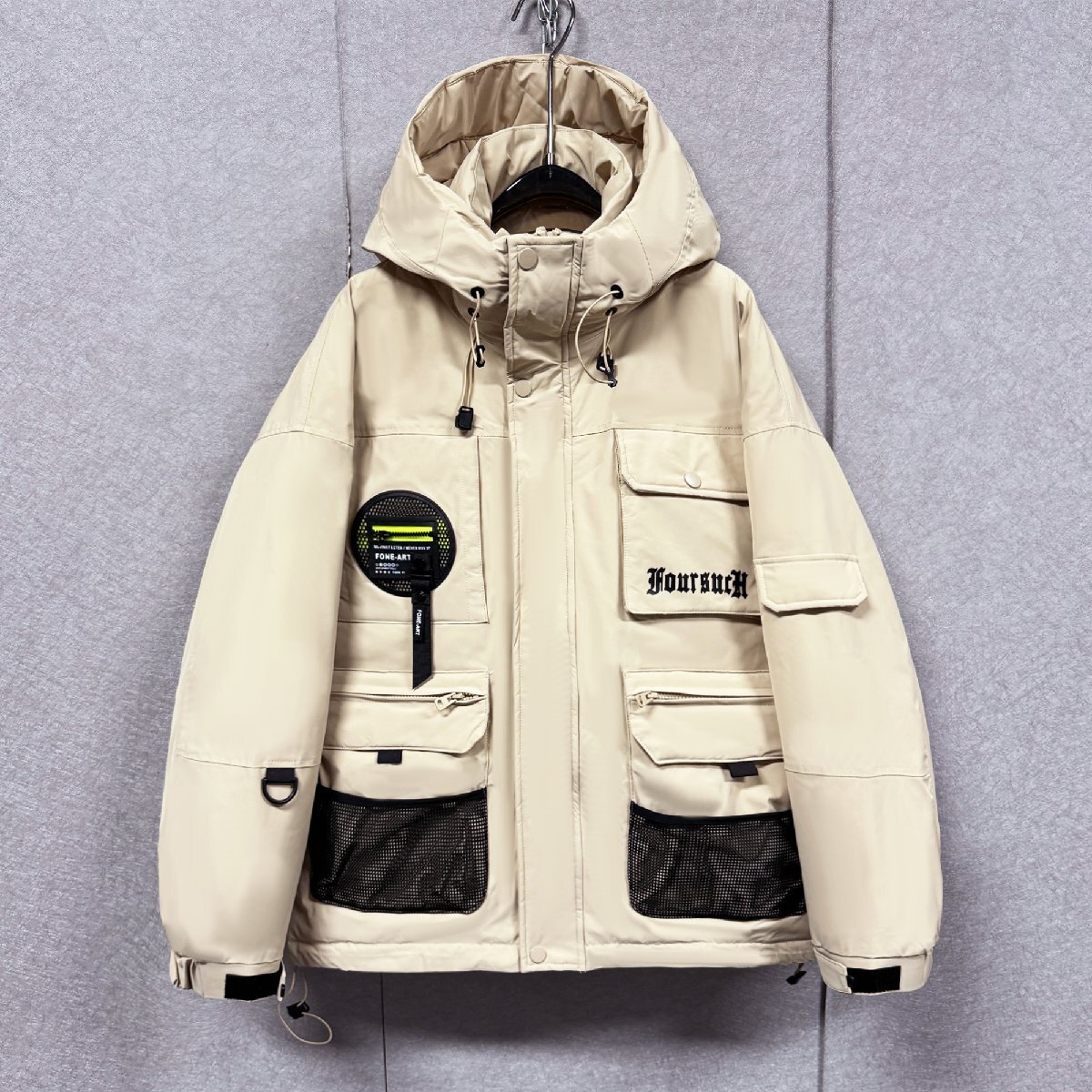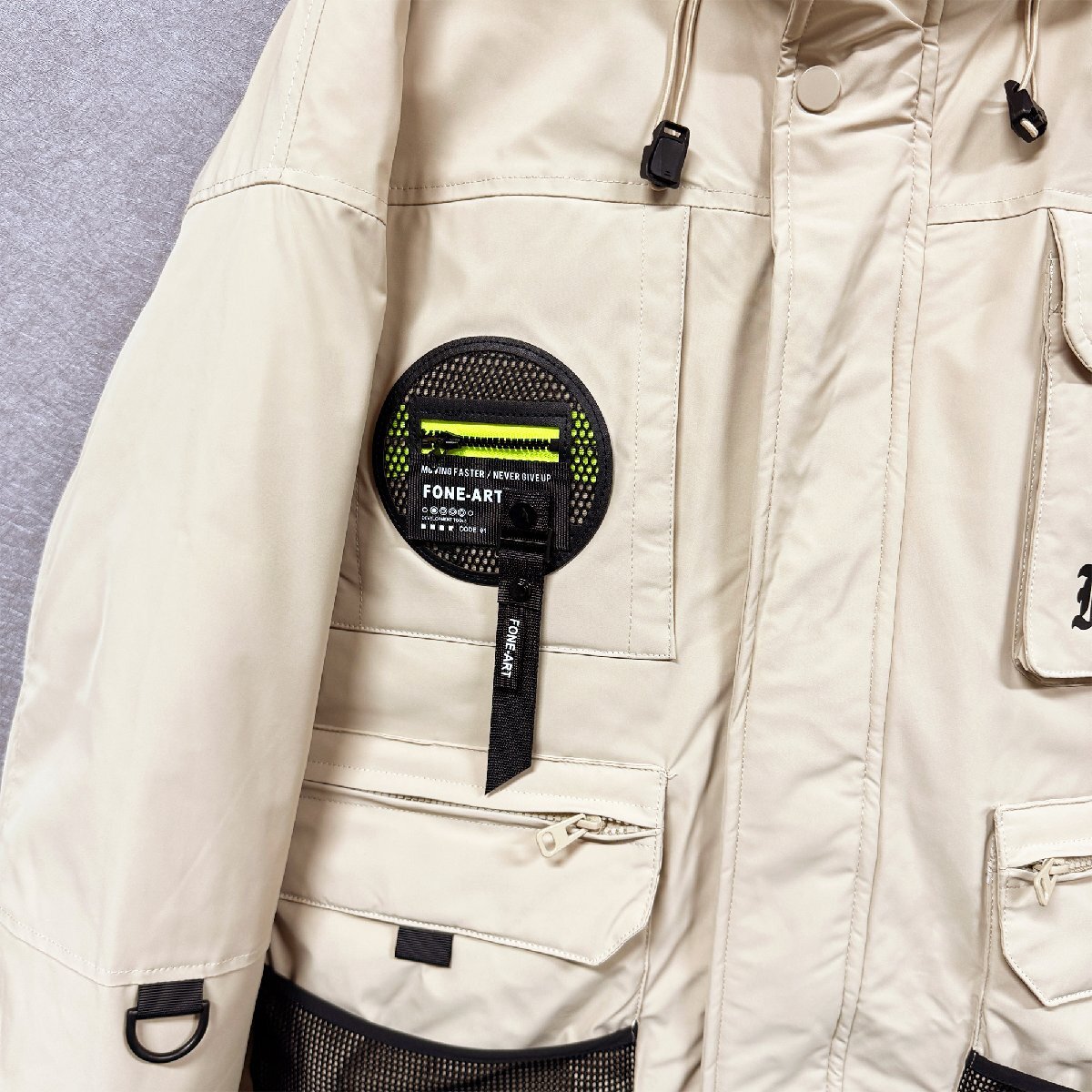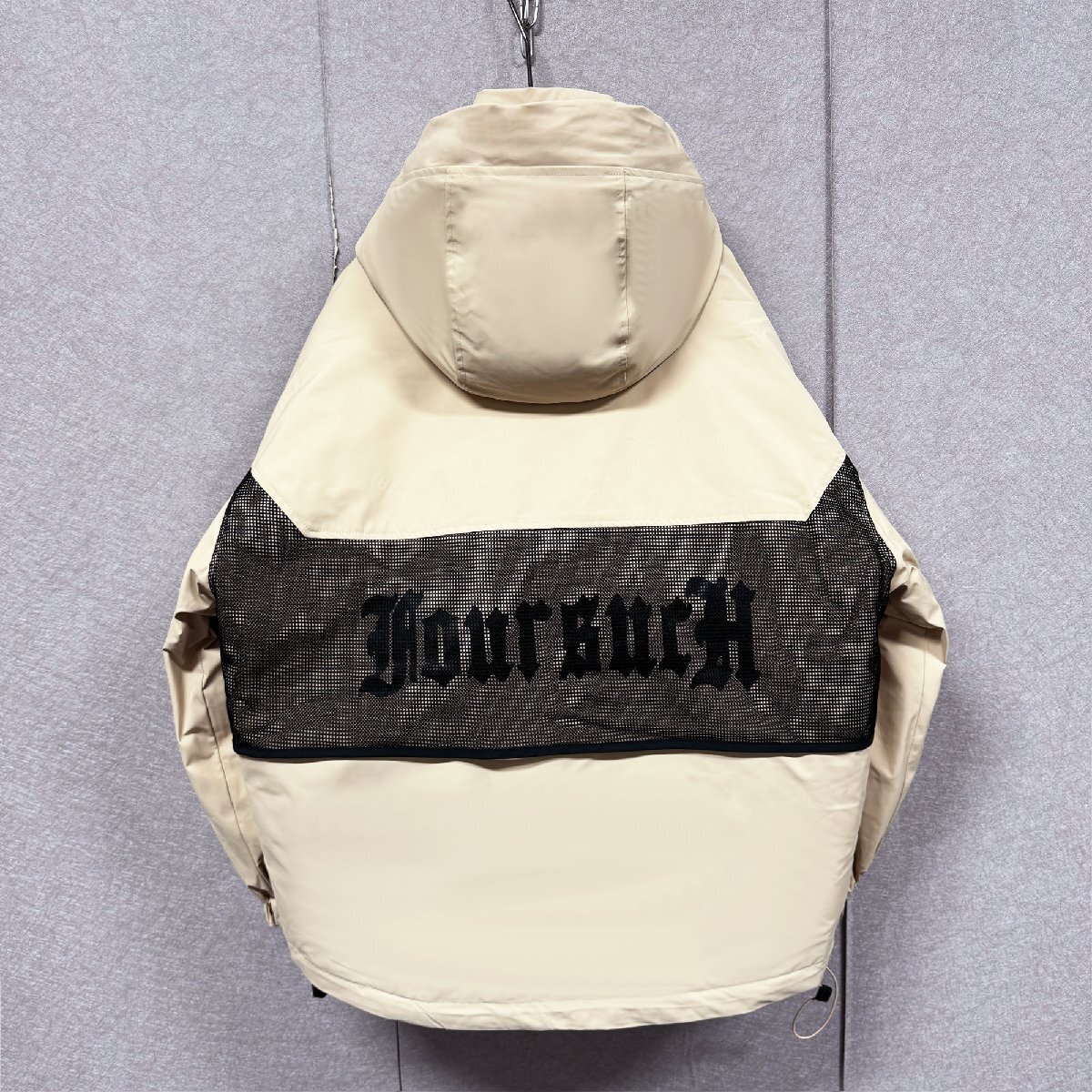 バックと右胸元にはインパクトのあるデザインが配置され、シンプルなデザインながらも存在感のある佇まいも魅力的です。フードは取り外し不可となり、ドローコードが付けられている為に、絞ることにより風の侵入を防ぐことが可能。裾にもシルエット調節が可能なドローコード付き、寒い季節には風の侵入を防ぐ効果も発揮してくれます。立ち襟のデザインは首周りから熱が逃げるのを抑えることができます。上まで閉めれば首元の防寒もしてくれる優れものです。フロントの三つ大きいサイズポケットがスナップボタン付き、スマホや貴重品を安心に入ります。