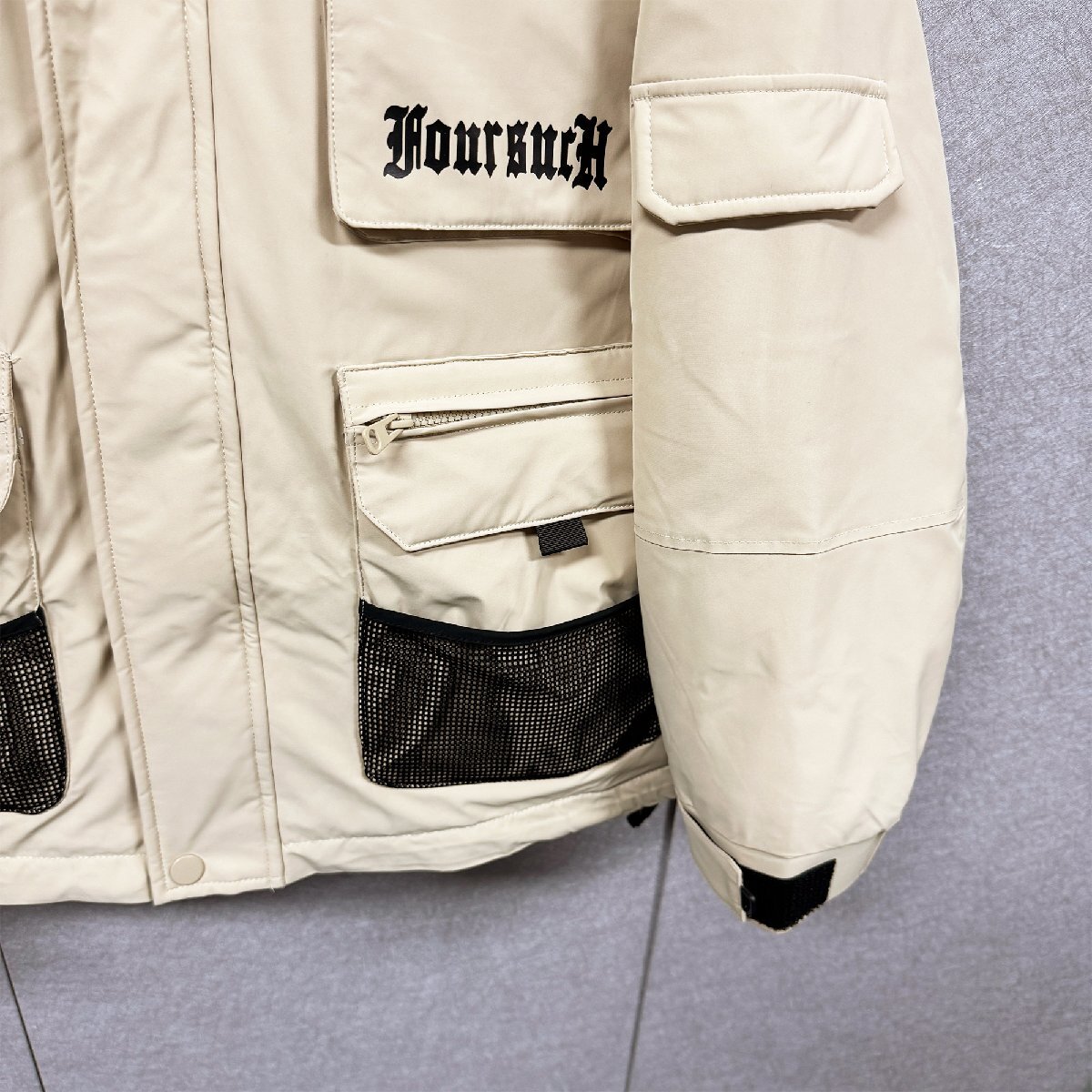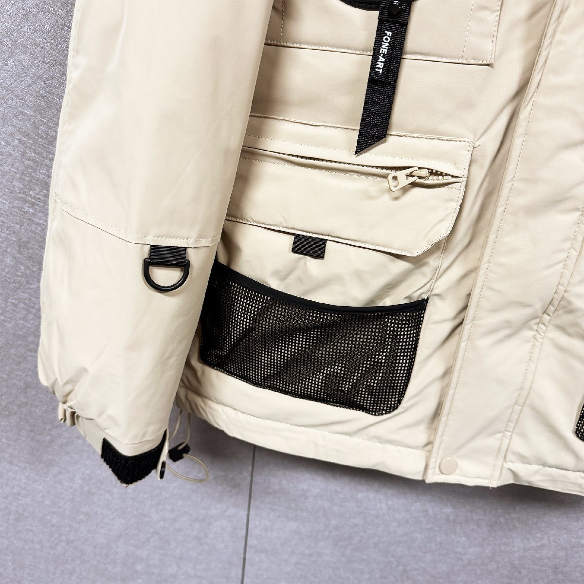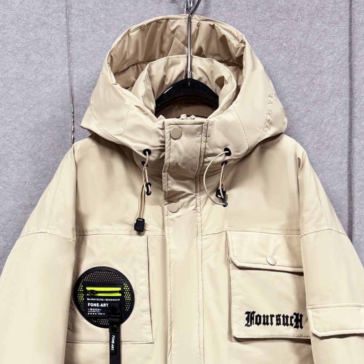バックと右胸元にはインパクトのあるデザインが配置され、シンプルなデザインながらも存在感のある佇まいも魅力的です。フードは取り外し不可となり、ドローコードが付けられている為に、絞ることにより風の侵入を防ぐことが可能。裾にもシルエット調節が可能なドローコード付き、寒い季節には風の侵入を防ぐ効果も発揮してくれます。立ち襟のデザインは首周りから熱が逃げるのを抑えることができます。上まで閉めれば首元の防寒もしてくれる優れものです。フロントの三つ大きいサイズポケットがスナップボタン付き、スマホや貴重品を安心に入ります。