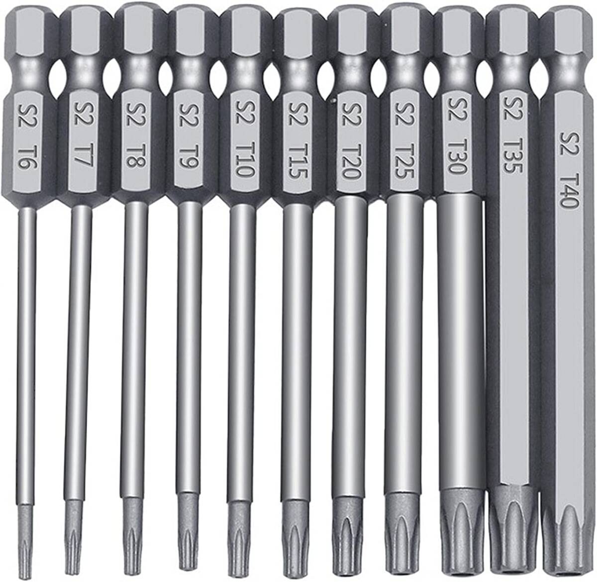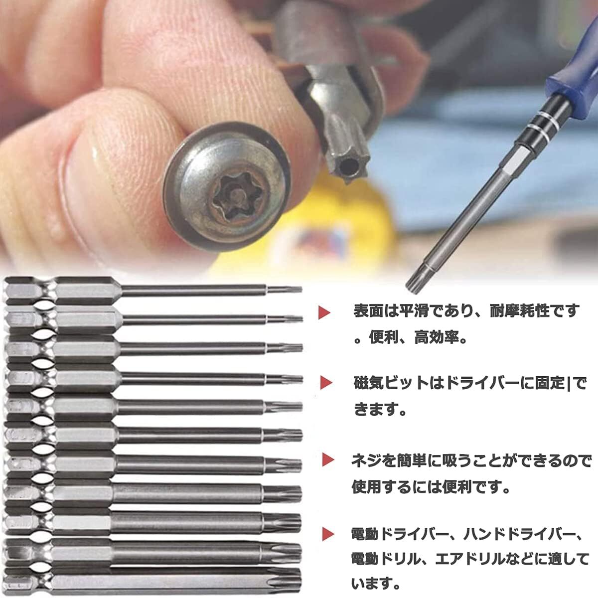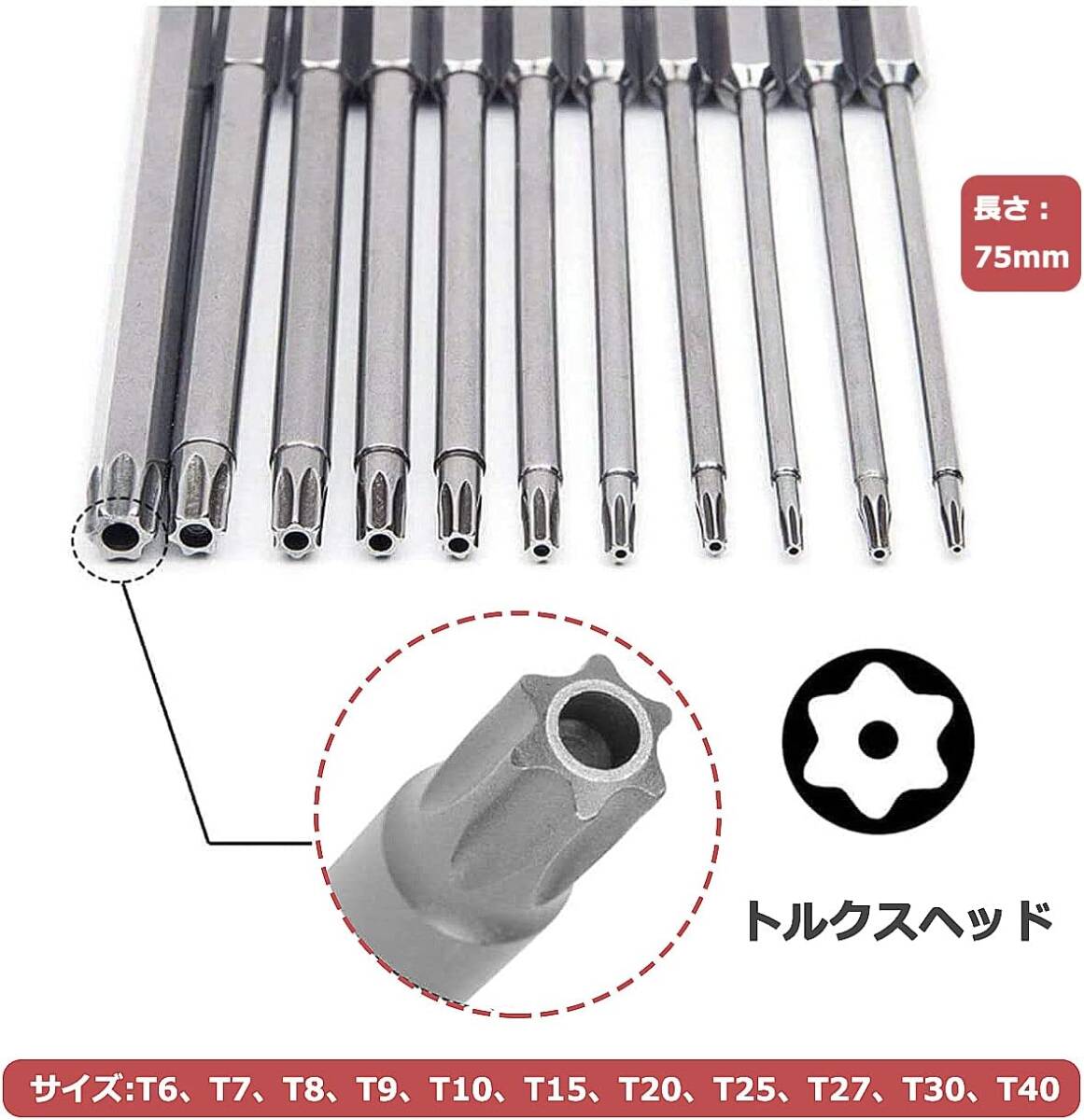 トルクスドライバー ビット 11本セット 中空トルクス頭 75mm 六角軸 6.35mm T6-T40 S2鋼ドライバービット 磁
