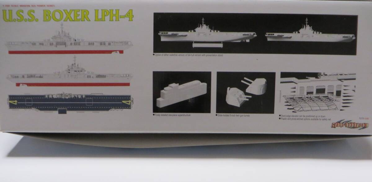 | ・ボクサーは米海軍のエセックス級の空母として1945年に就役しました ・第2次世界大戦には間に合いませんでしたが、朝鮮戦争、キューバ危機、ドミニカ内戦、 アポロ帰還船の回収などの歴史的な重要なミッションに従事しました ・その間、対潜水艦作戦支援空母を経て最終的に強襲揚陸艦へ艦種変更されました ・艦橋は一体成形 ・アンテナパーツは新金型で精密にパーツ化 ・艦載機UH-34J シーホースは新金型で再現(8機分) ・5インチ2連装機銃の砲塔部分はスライド金型を使用した一体成形 ・セーフティーネットはプラパーツ/エッチングパーツを選択して製作可能 ・エレベータは上下位置選択可能 ・レーダーなどはエッチングパーツで再現 ・喫水線で上下にパーツ分割されていますので様々な展示方法が可能(スタンド付属) ・デカールはカルトグラフ印刷の新規デカール |