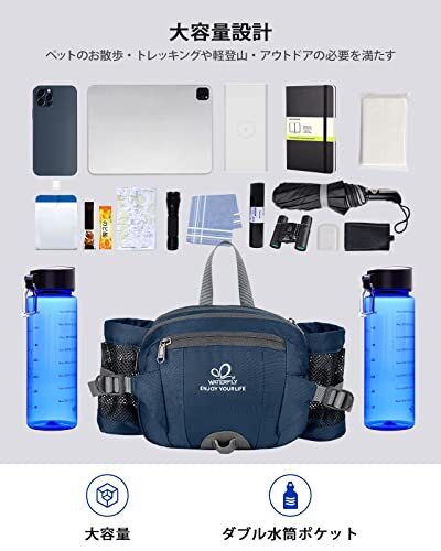 WATERFLY(ウォーターフライ) ウエストバッグ ウェストポーチ ワンショルダーバッグ 水筒ポーチ付き 多機能 軽量 大容量 ボディバッグ メンズ レディース (ネイビーブルー)