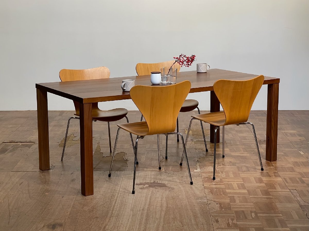 ミニマムでオーセンティックなテーブルデザインに、みずみずしく流れるような質感の杢目に荒々しい節材をセレクトした品のよいモダンダイニングテーブル。