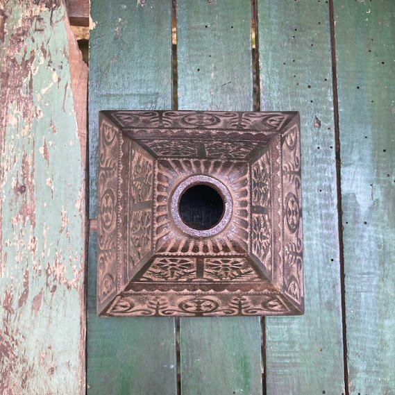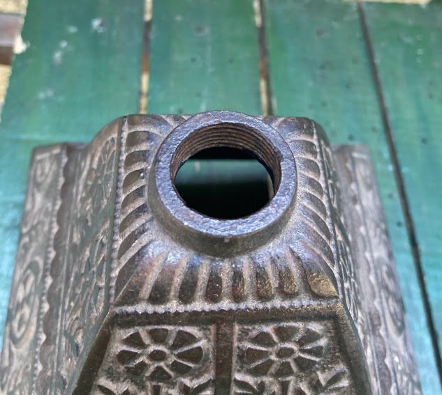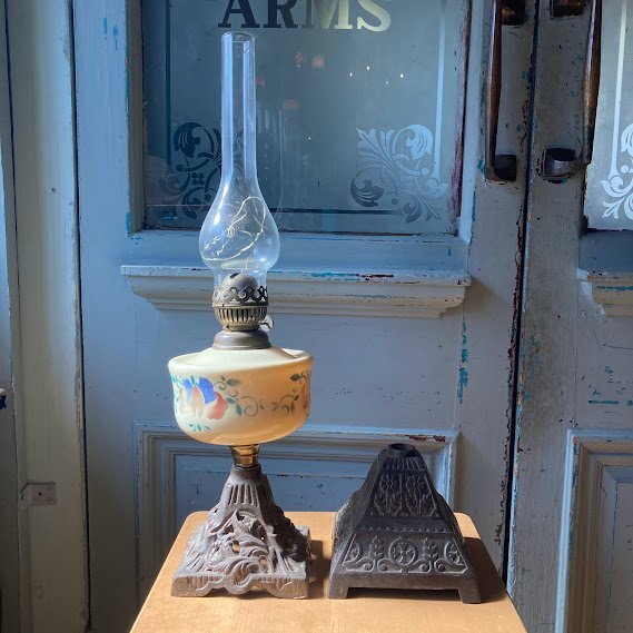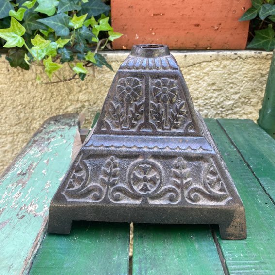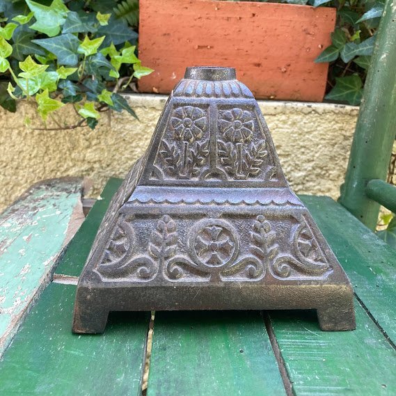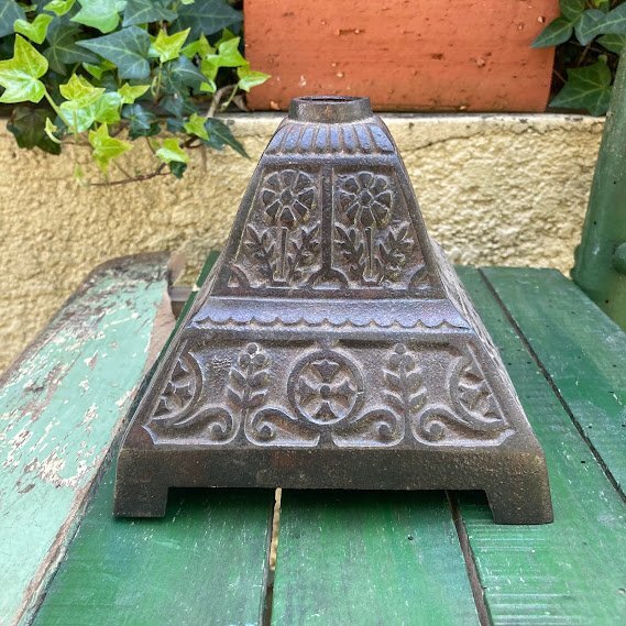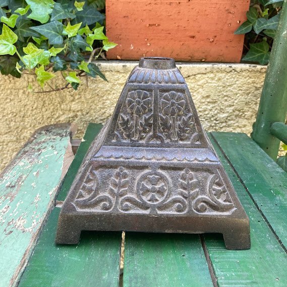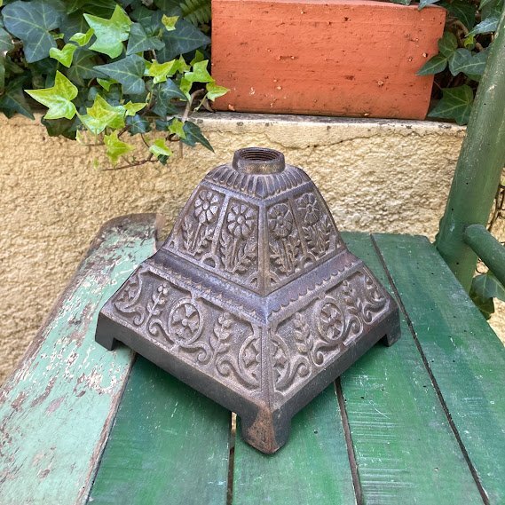 イギリスより入荷しました。推定1900年代ヴィクトリアンのランプベース(オイルベースなどとも呼ばれます)。オイルランプなどの土台そして使用されていたものとなります。別のランプと比較していますのでその画像をご覧くださいね。こちらはマーガレットのようなお花と植物を組み合わせたデザイン。上部にランプと連結できるようにネジ式の穴が開いています。ランプベースとしてのご利用はもちろんのこと、このアイアンの風合いを生かしてグリーンを飾っても素敵ですし、ランプシェードなどに改造して使用する方法も面白いですね。オリジナルの使い方を楽しみたい方におすすめ。風合いを残すため軽く拭き上げのみとなります。ピカピカの新品をお求めの方はご遠慮ください。福岡市南区の店舗にてお渡しもできますのでお気軽にどうぞ!