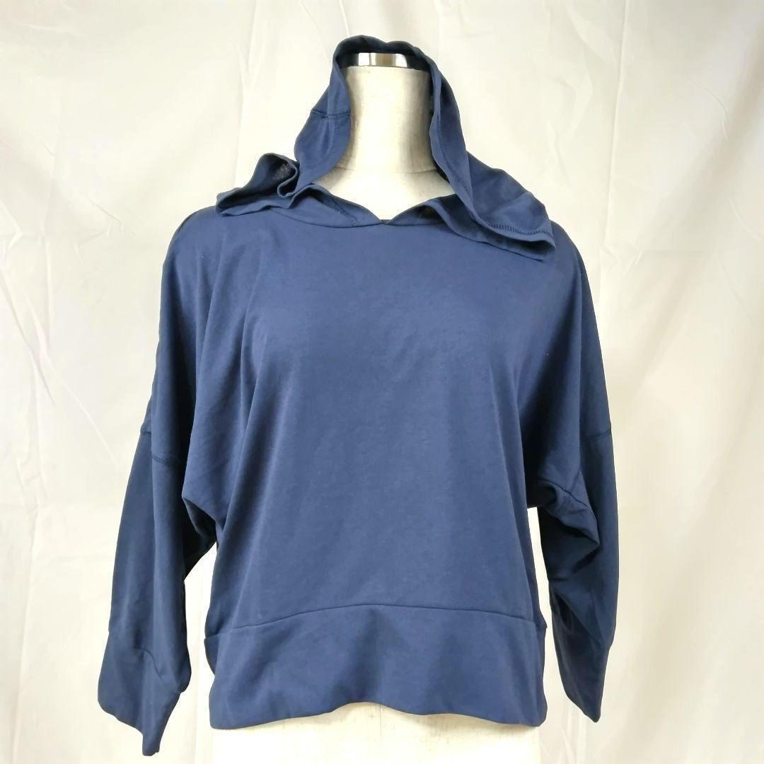 フード付きのネイビーカラー、柔らかい生地のルーズフィットパーカー。