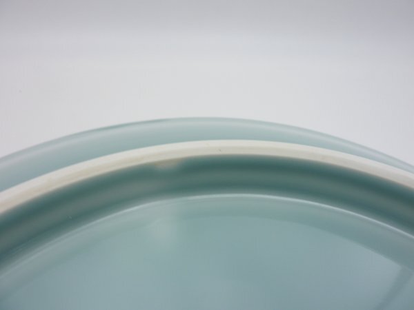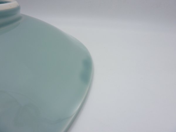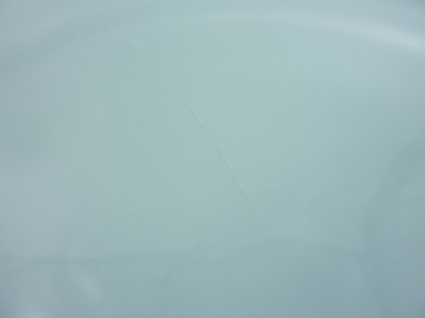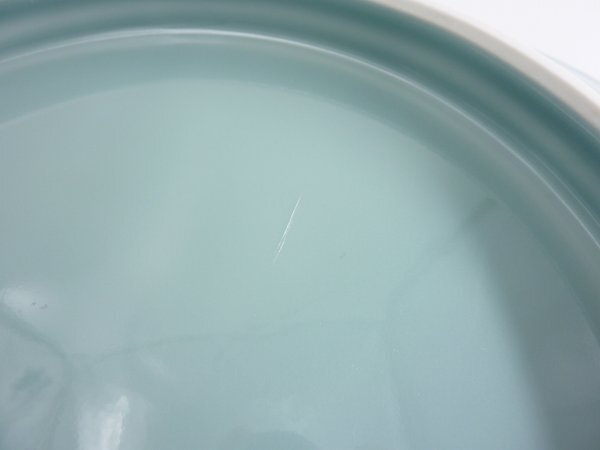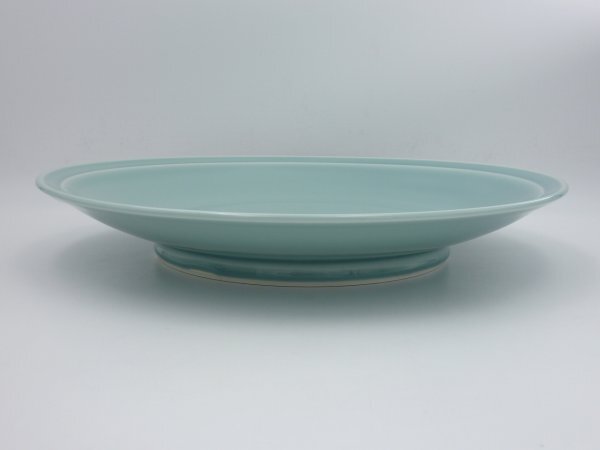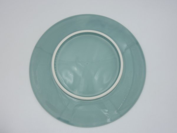 | 蔵出し品、美濃焼から特大サイズ約42.4cmの青磁の大皿1個です。 新品からの未使用保管品ですが、出品に際して現品検品致しましたところ、 とくに表面中央に約4.5cm程の長さの貫入(釉薬表面のひび割れのような模様)が見られました。 こちらは意図的に施したものではなく焼成後の収縮で生じてしまったかと思われます。 他にも小さく1cm程のものと2cm程のものも見られました。 また表面に1cm程の釉薬内部でのキレのようなものが一箇所、擦り傷は細かいものも含めますと多数見られます。 とくに裏面中央にははっきりとわかる約2cm弱の引っかきキズがございます。 その他、上掛けされた釉薬の溜まり部分やタレ跡、波を打っている箇所、とくに底裏弾けた箇所、釉薬面の濃淡、とくにリム部分にみられるごく小さな点状のような釉薬面の部分(焼成中の温度差で生じる泡の痕のような点々の釉面)等は性質上どうしてもございます。 (以上抜粋してアップ画像有) 底面は再研磨済で滑らかには仕上げておりますが、糸底部分の小さな黒い点や焦げのような痕、小さな凹みや穴等はご了承ください。 やきものの性質上ならびに製造ロットの違いもあり、それぞれ大きさ重さの誤差、水平度(形状のたわみ)、釉薬のタレ跡や波打ち、色ムラ、色合いの異なりがございます点、予めご理解ください。 製造から運搬過程ならびに保管上にて生じたと思われる小さなすり傷や引っかきキズ、そのほか細かい箇所や気付けていない箇所等も万一ございましたら、全て初期からのもしくは性質上の品質となります為、合わせまして何卒ご了承くださいませ。 掲載画像も全点ご参照頂きましたうえ、ご検討くださいますとさいわいです。 ![]() 【クリック】この他にも随時蔵出し出品しております。【クリック】 |
