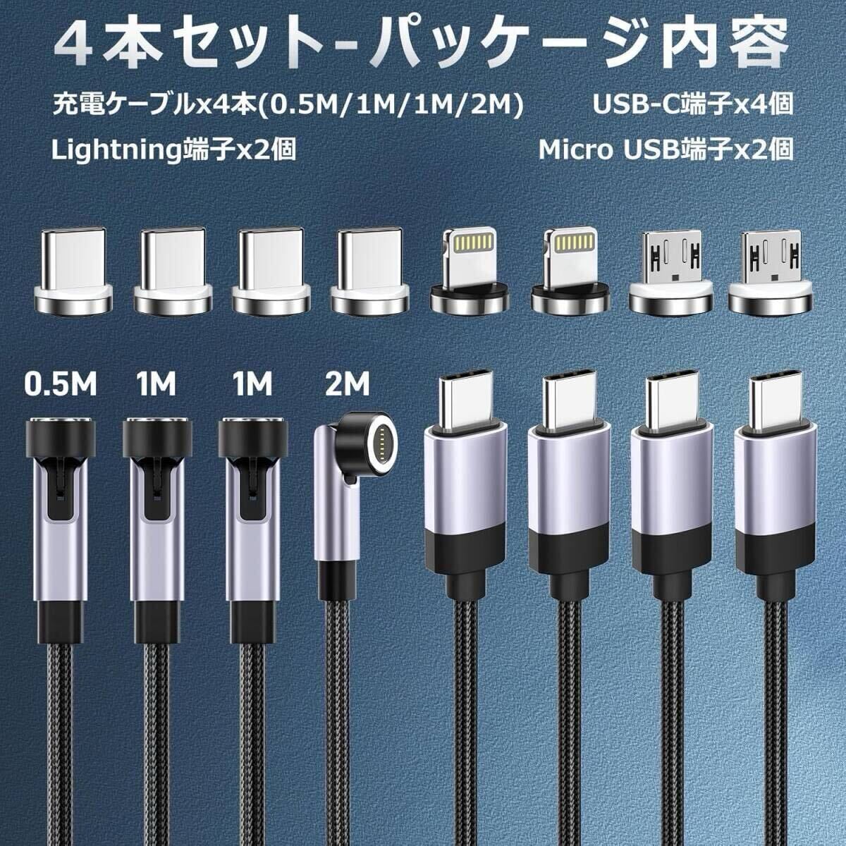 マグネット 充電ケーブル タイプc急速 3in1 60W PD対応 7ピン 【4本セット・0.5m+1m+1m+2m】