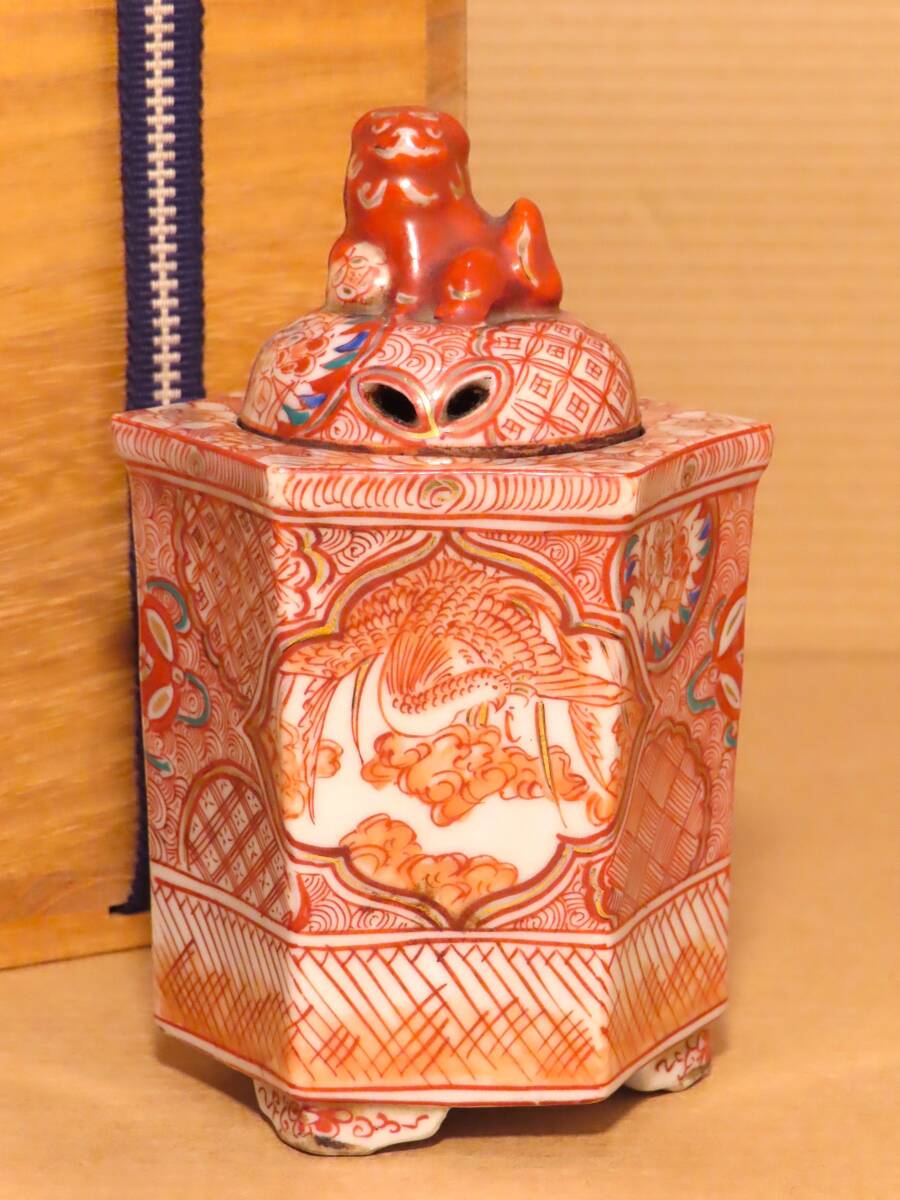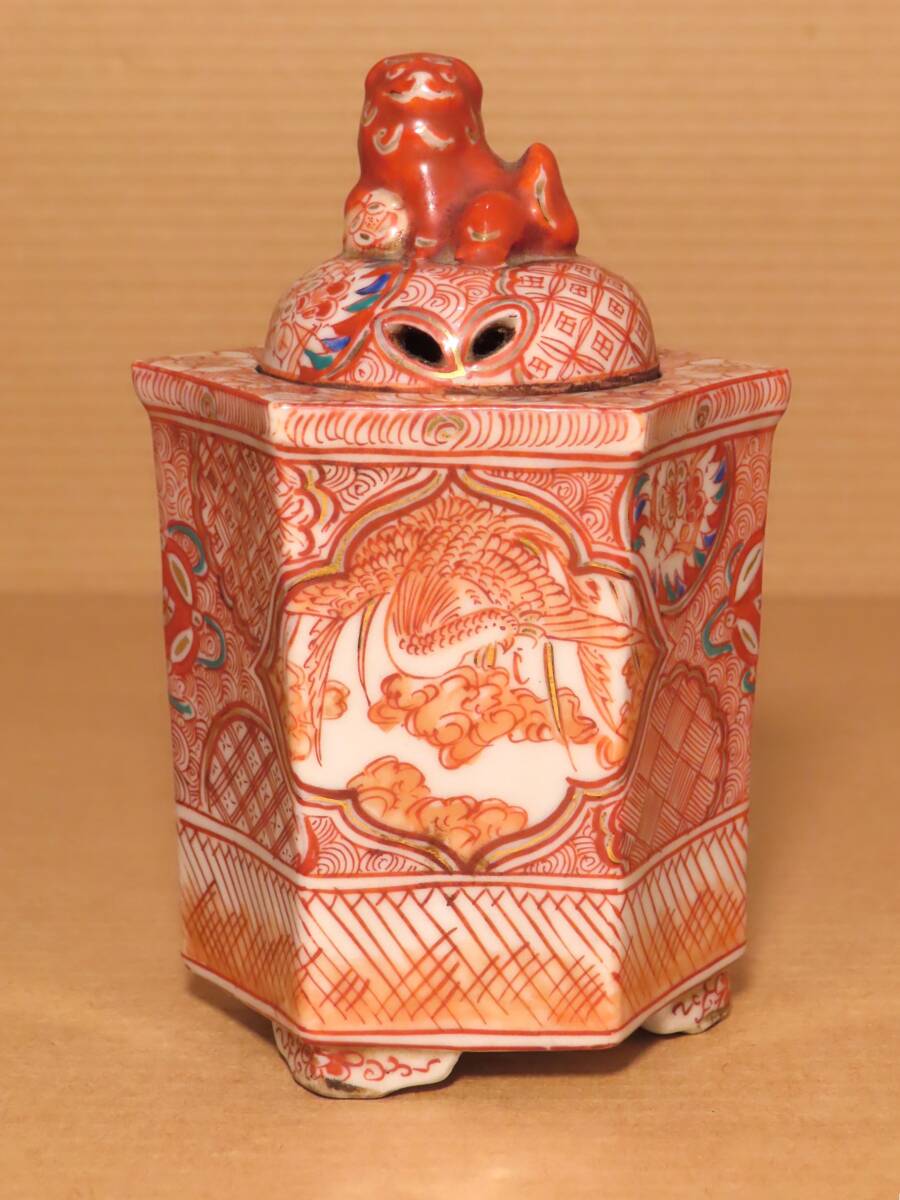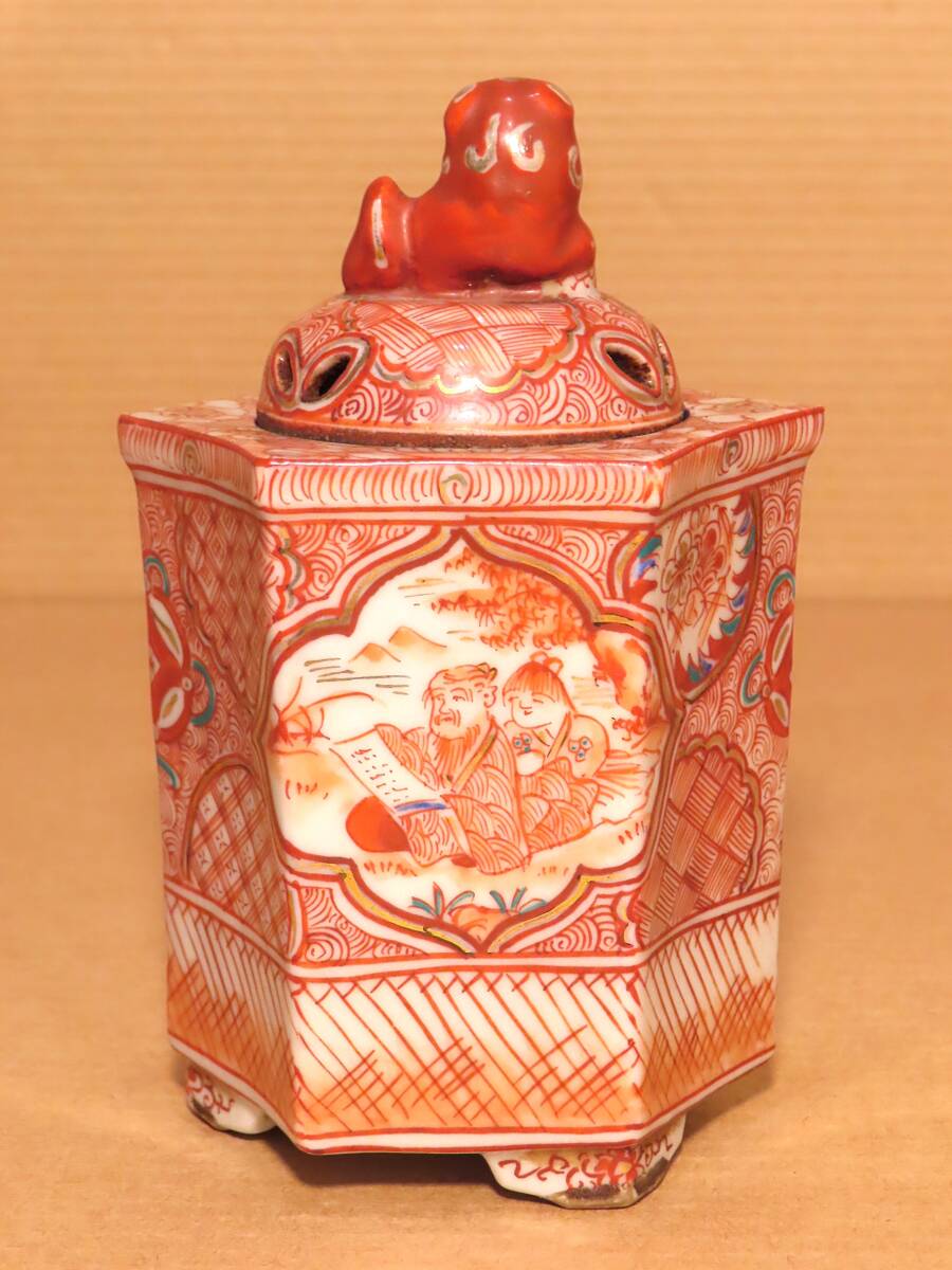 古九谷 赤絵 六角 鳳凰 人物 獅子摘蓋 角福 香炉 茶道具 骨董
