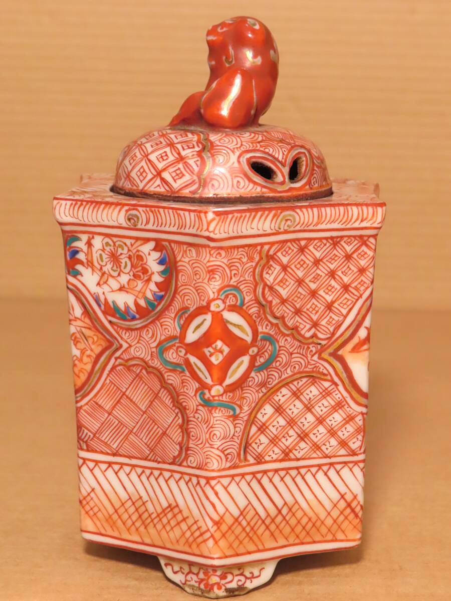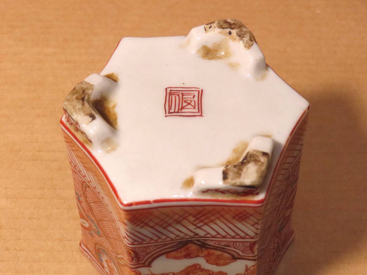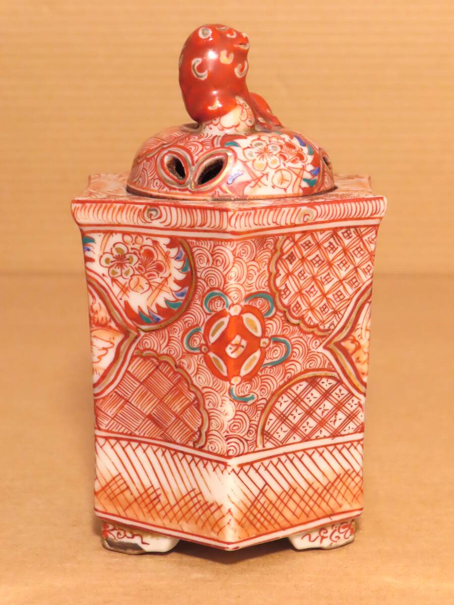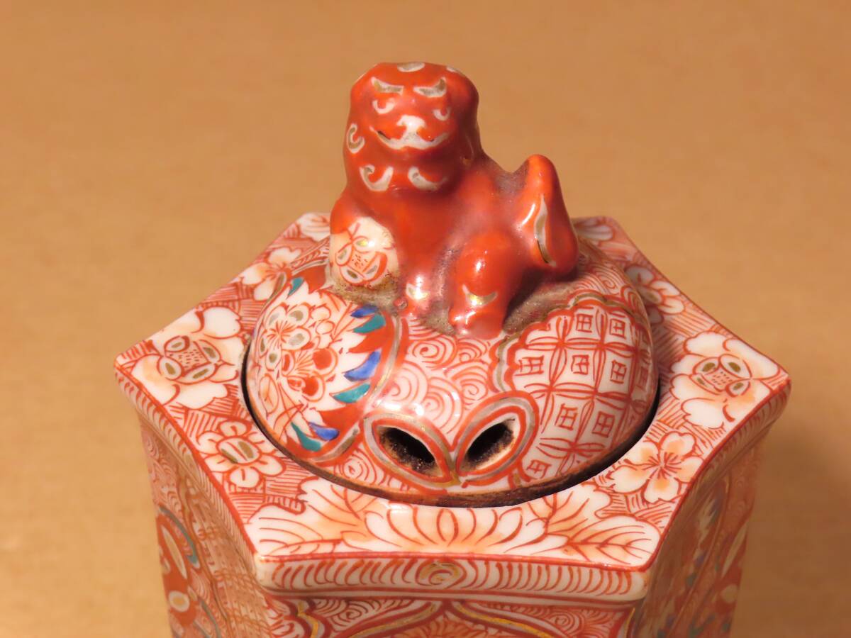 古九谷 赤絵 六角 鳳凰 人物 獅子摘蓋 角福 香炉 茶道具 骨董