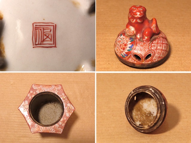 古九谷 赤絵 六角 鳳凰 人物 獅子摘蓋 角福 香炉