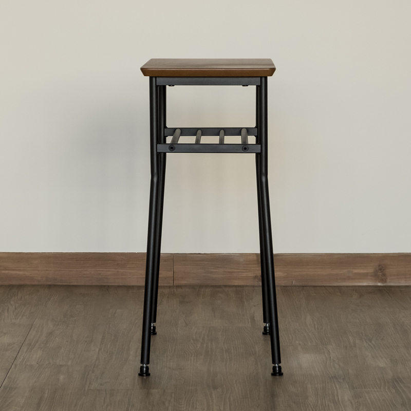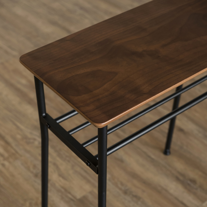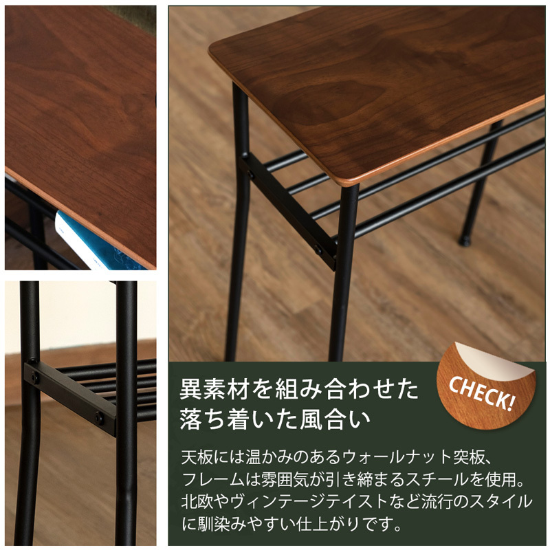 | 材質 | 天板: ABR)合成樹脂化粧繊維板(PVC貼り) WAL)天然木化粧繊維板(ウォールナット突板)、ラッカー塗装 棚・脚:スチール、エポキシ粉体塗装 首振りタイプのアジャスター4個付き |