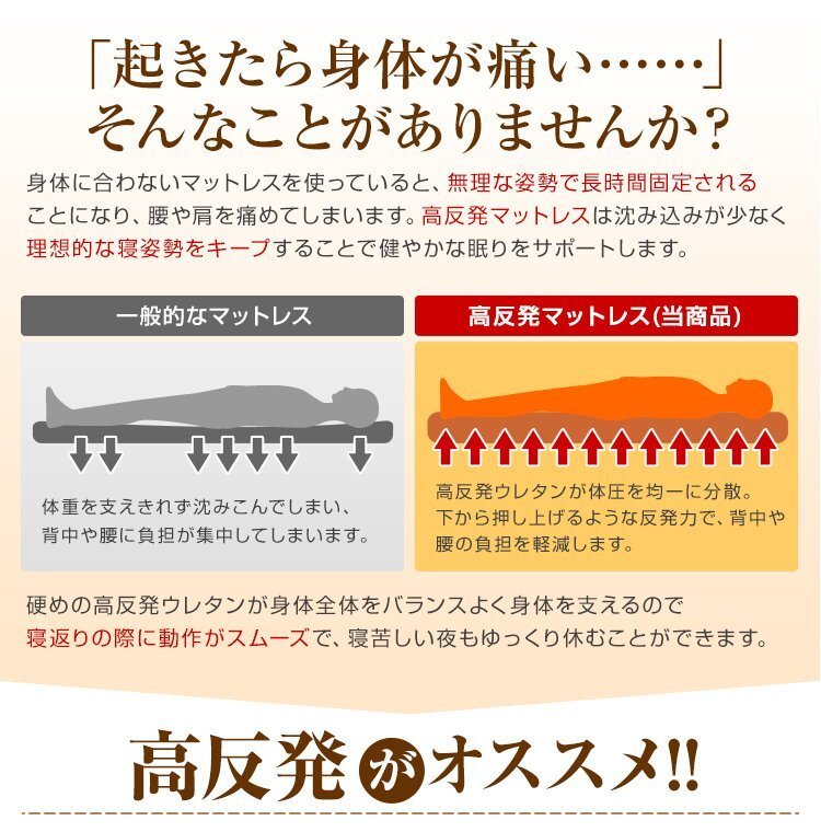 | 厚みたっぷり10cm! 適度な硬さで身体をしっかり支える、三つ折りタイプの高反発マットレスです。 柔らかいマットレスとは違い、身体の沈み込みを軽減した腰に優しい寝心地です。 高反発マットレスのウレタンフォームは弾性が高く、適度な硬さで身体を支えるので、底つき感もなくへたりにくいマットレスです。 寝返りが多い方や仰向けに寝ることが多い方におススメです。 簡単にたためる三つ折りタイプなので、お部屋で立て置きして日当たりのいい場所で部屋干しが可能! 取り外しやすいL字ファスナー付き洗えるカバーが付属しています! 【商品仕様】 カラー:ブラウン サイズ(約):幅120cm×長さ195cm×厚み10cm(セミダブルサイズ) 折り畳み時(約):幅97cm×長さ65cm×厚み30cm 素材:高反発ウレタン 、パイル生地 他 硬さ:210ニュートン ※耐熱仕様ではございませんので、電気毛布との併用はおやめください。 (マットレス シングル セミダブル ダブル 高反発 低反発 高反発マットレス 低反発マットレス シングル 高反発マット 低反発マット マット ベットマット ベッド 敷き布団 洗える カバー 寝具 人気 おすすめ ) |