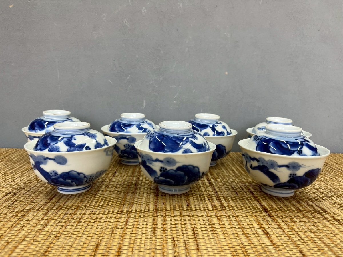 蔵出し 時代物 食器 ミニ丼 丼 陶器 松 古い食器 染付 飯椀★茶碗7客