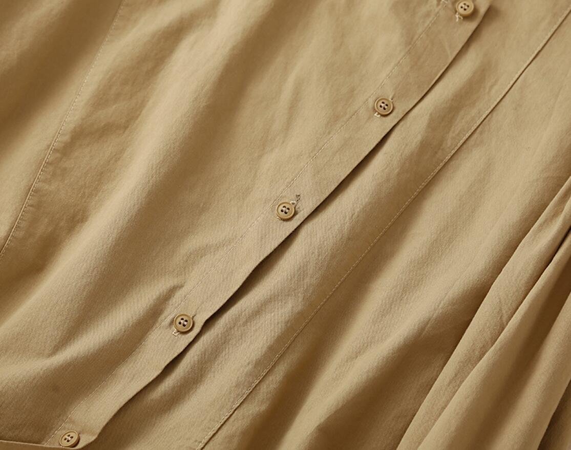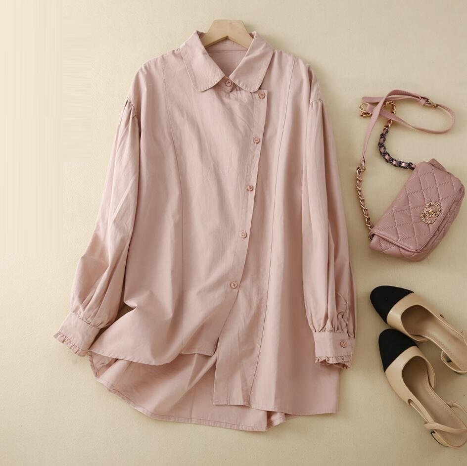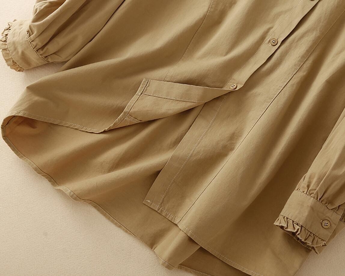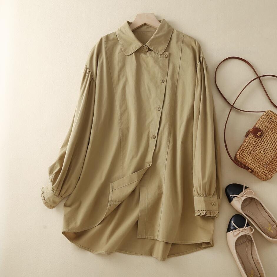 秋新品 不規則 コットン 長袖 トップス 大きいサイズ オフィス 通勤大人 シャツ チュニック★カーキ/XLサイズ