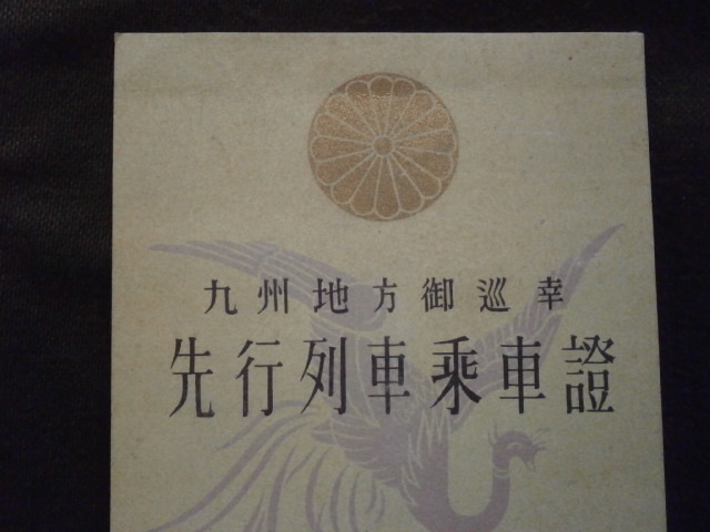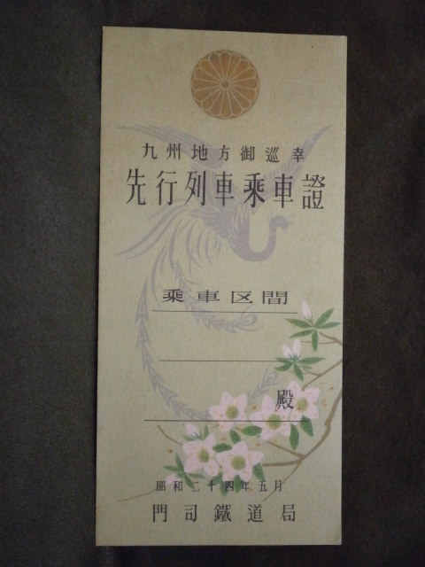 鐡道省 門司鐡道局発行、九州地方御巡幸 先行列車乗車證です。