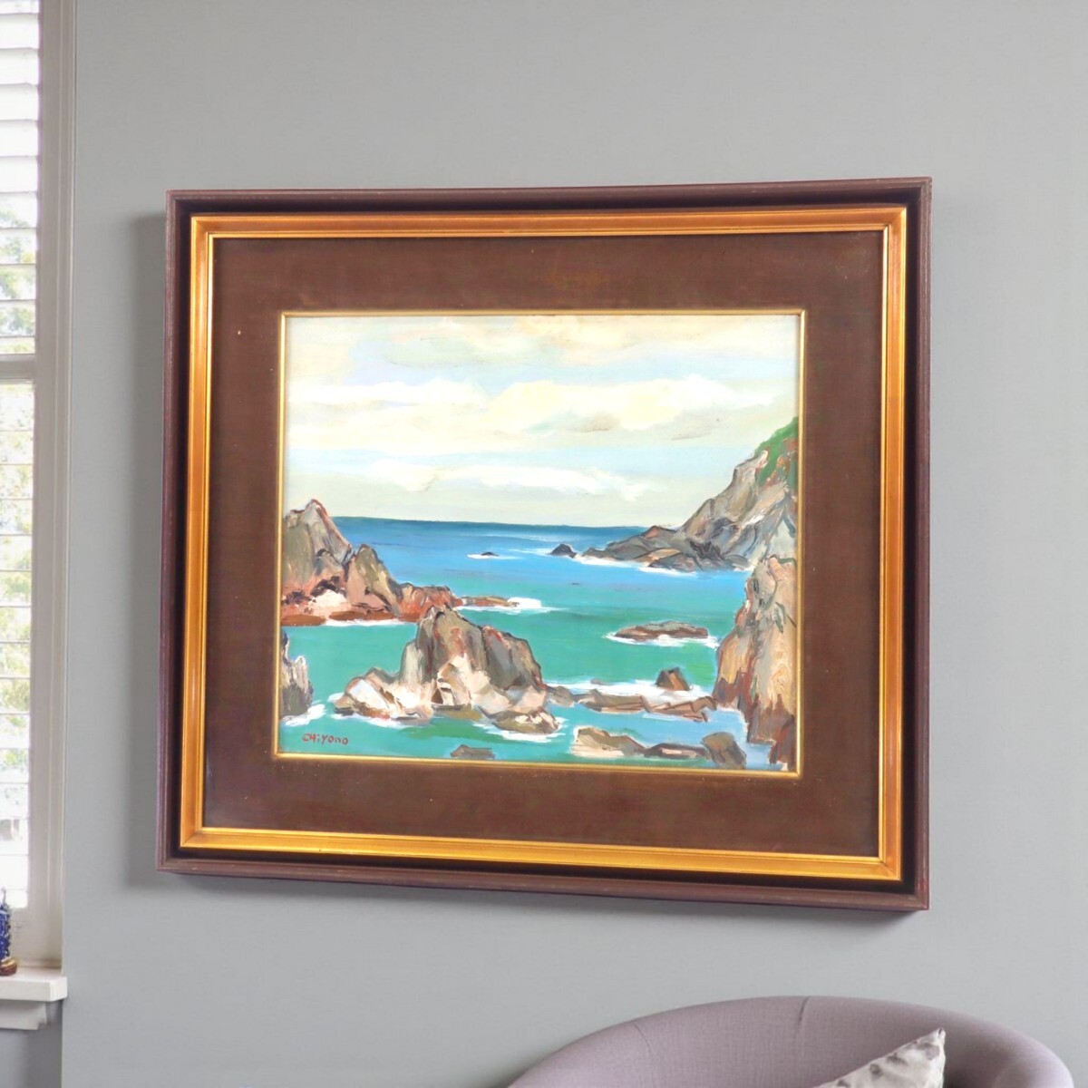 荒々しい岩肌と穏やかな海面の対比が印象的な作品です。