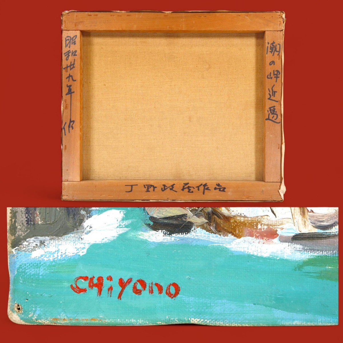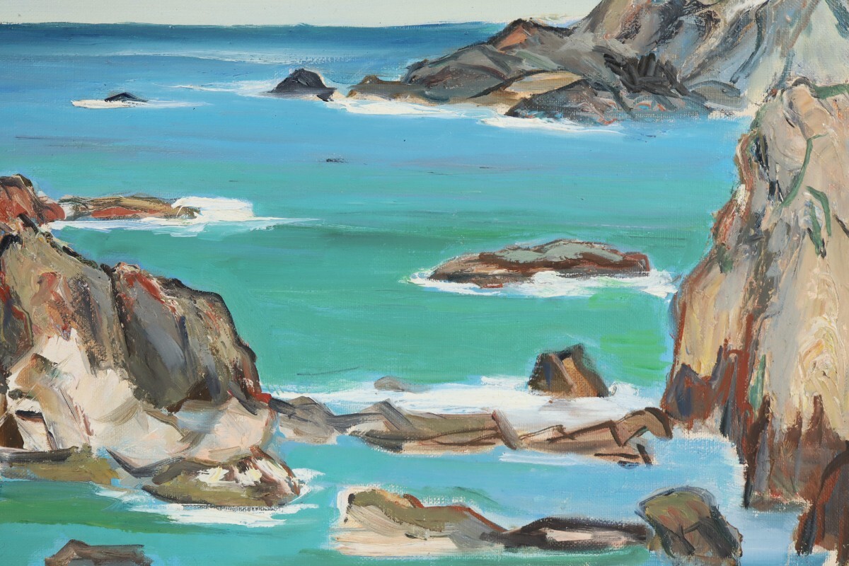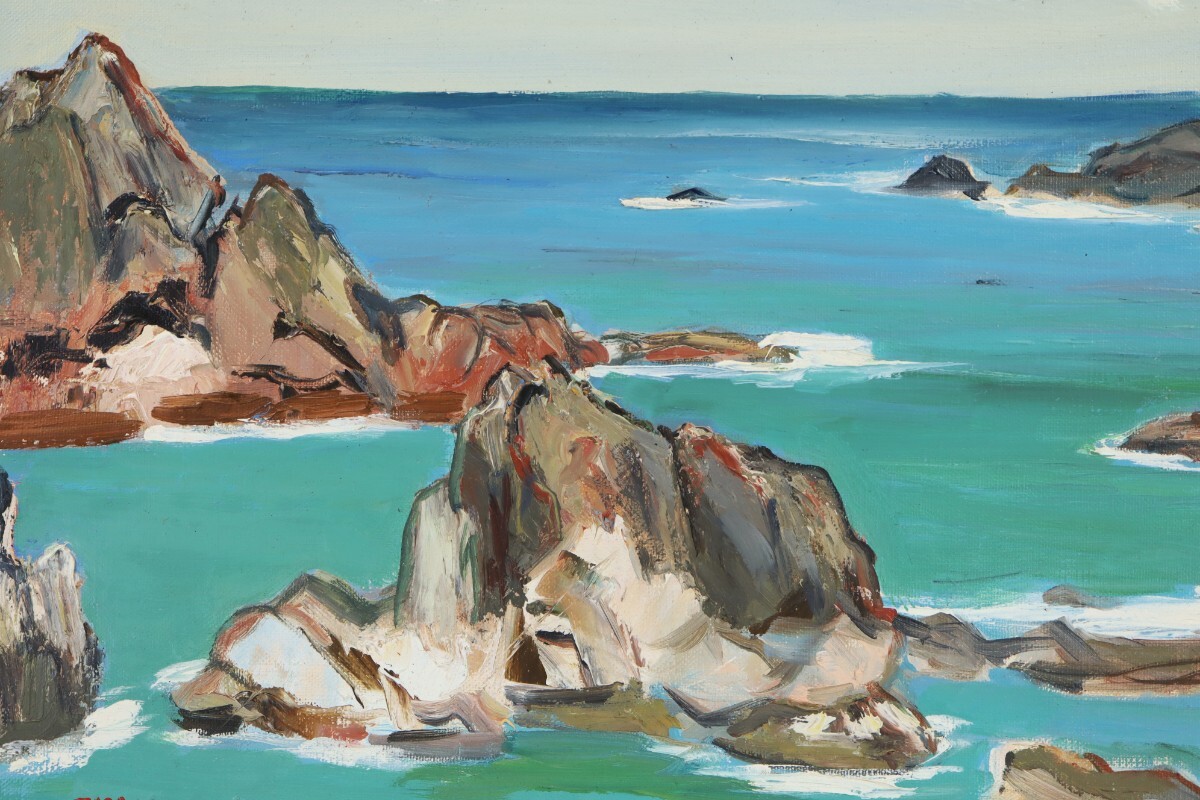 真作 丁野政蔵 1964年 油彩「潮の岬」画寸 F8 和歌山県、南紀の海を描く作家 力強い筆致 荒々しい岩肌と穏やかな海面の対比が印象的 11663
