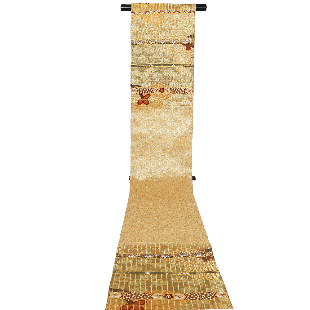 | 色・柄 | 西陣織袋帯 金・緑地 松・桐・パルメット唐草文様 (写真では上手く色が出ない場合があります。ご了承下さい) ※お使いのディスプレイの種類や設定の差により 実物の色と画像の色が少々異なることもございます。 |