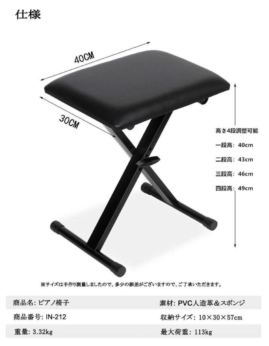 ピアノ椅子 チェア イス 折畳 ベンチ 4段調整 キーボード椅子 刺繍カバー付