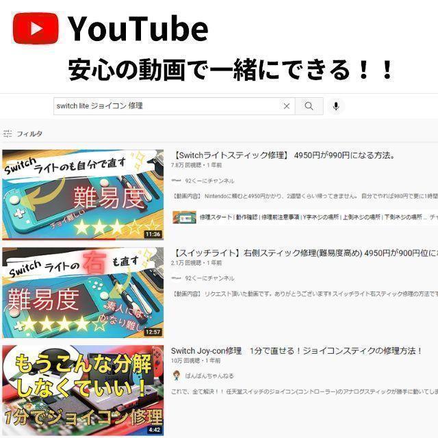 スティック交換の操作動画はYouTubeに「スイッチライト修理」で検索するのをおすすめします。