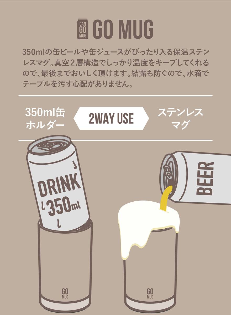 ・缶ジュースや缶ビールがぴったり入る保温・保冷ステンレスマグ「CAN.GOMUG.350」真空断熱2層構造で美味しい温度をしっかりキープしてくれます。