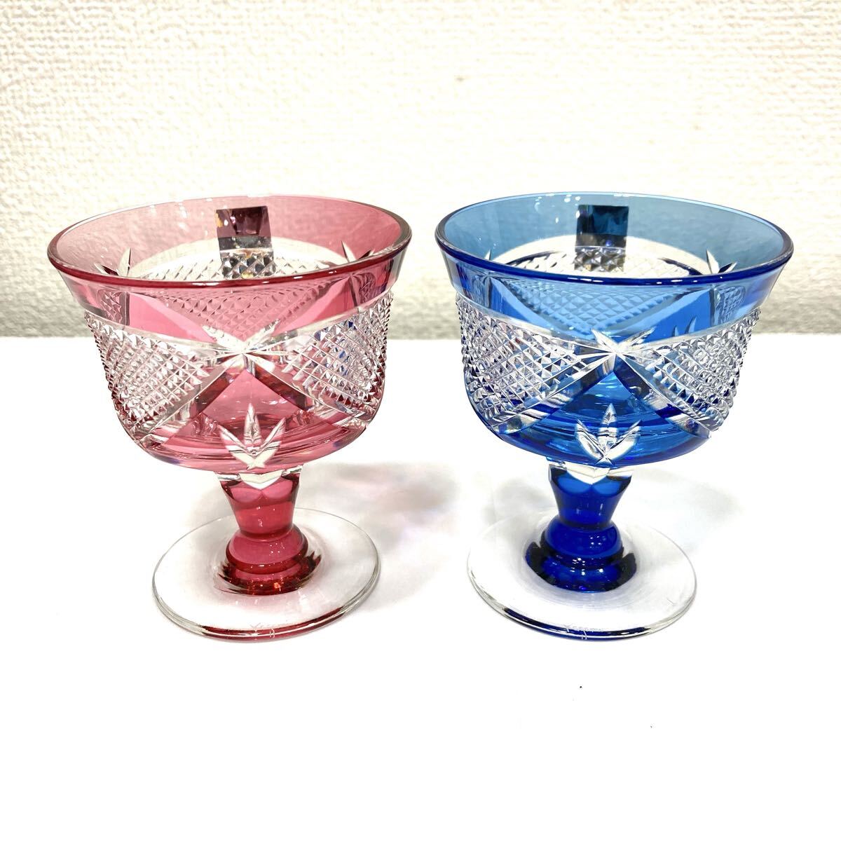 TA★1円~ 未使用 保管品 KAGAMI CRYSTAL カガミクリスタル 江戸切子 色被せ ペアグラス レッド ブルー 懐石杯